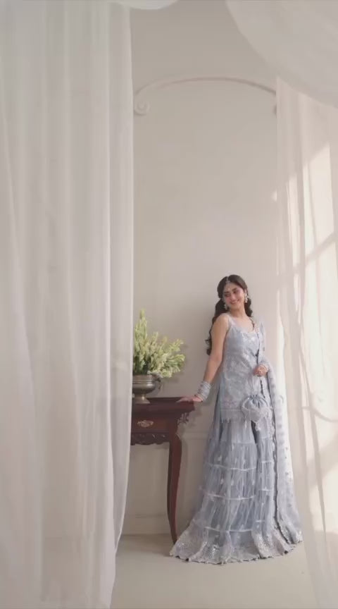 Channeling effortless refinement, Oya is a poetic balance of fluid drape and structured tailoring. Rendered on an ice blue net, the shirt comes intricately embroidered. This set is paired with an embroidered net gharara and an embroidered net dupatta, evoking serene movement. The interplay of sheer fabrics and a striking silhouette lend an air of contemporary sophistication, putting you in the spotlight at every occasion.