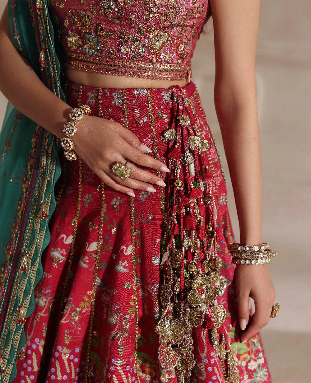 Radiant in hot pink raw silk, this lehenga celebrates festive charm with a bold yet graceful spirit. The shikargah inspired blouse dazzles with intricate adda work where muted rosewood florals bloom across the bodice, kissed with golden sequins that shimmer with every movement. The neckline framed in an ornate gold jaal, lends a regal aura to the silhouette balancing the vibrance, a contrasting teal dupatta cascades in harmony, adorned with vertical floral vines and delicate detailing for depth and dimension. A true ode to heritage and craftsmanship, this ensemble blends bold color play with timeless artistry designed to leave an unforgettable impression.