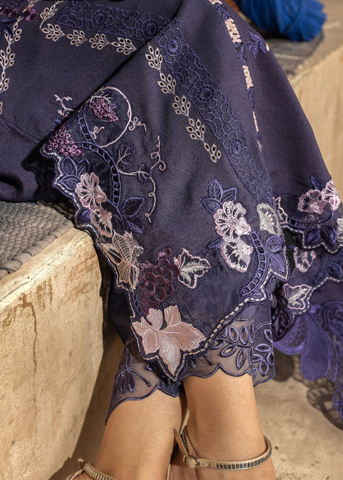 A symphony of winter luxury, unfolds as a refined elegant masterpiece of artistry. Set against a royal deep iris canvas, this ensemble transforms into a regal showcase of intricate floral embroidery in shades of mauve, primrose pink, and purple. Cutwork like embroidery running down the panels dancing with the floral, grape and maple leaf motifs. An opulent purple tone harmonises beautifully with the divided composition enveloping the wearer in an air of sophistication and regal splendor. Paired with a woollen shawl , gracefully adorned with a scatter of floral motifs, framed with delicate scallop borders on organza. The trousers are enhanced by intricately embroidered borders. A vision of unparalleled winter refinement.