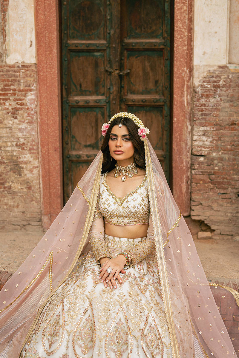 A graceful white lehnga adorned with delicate pani embroidery and subtle adda work, exuding understated elegance. It is paired with an ethereal organza dupatta, beautifully detailed with chan, tilla, and organza patches, and finished with an elegant border that enhances its timeless allure. A perfect harmony of sophistication and tradition.