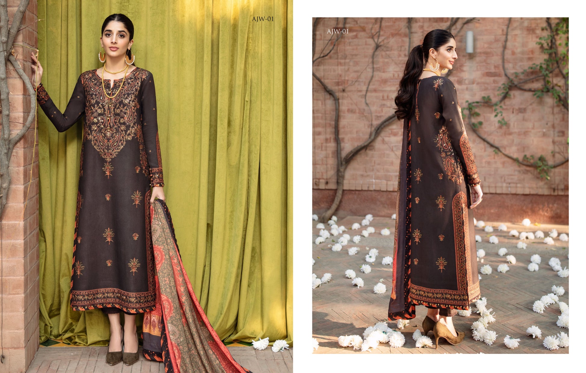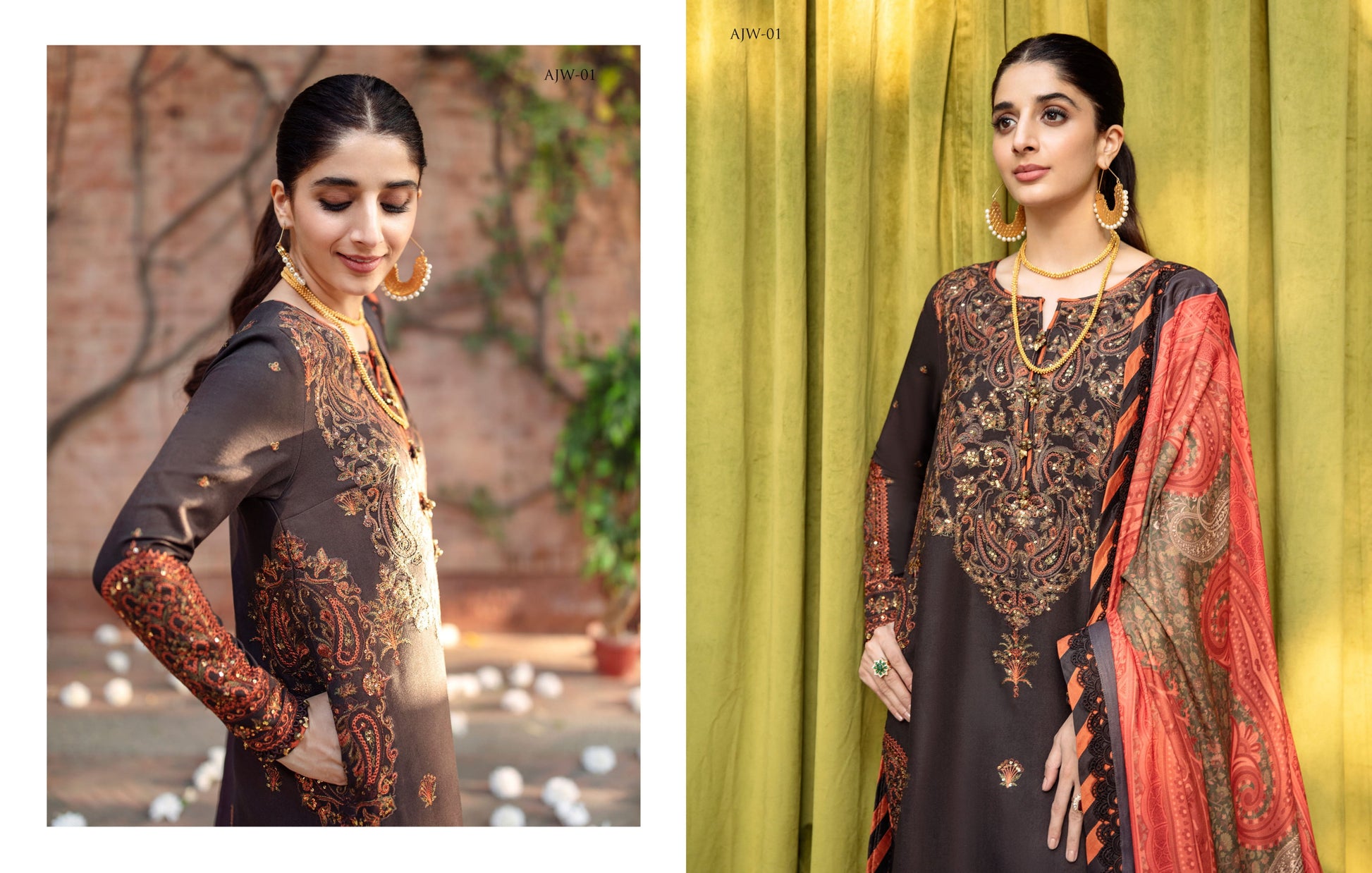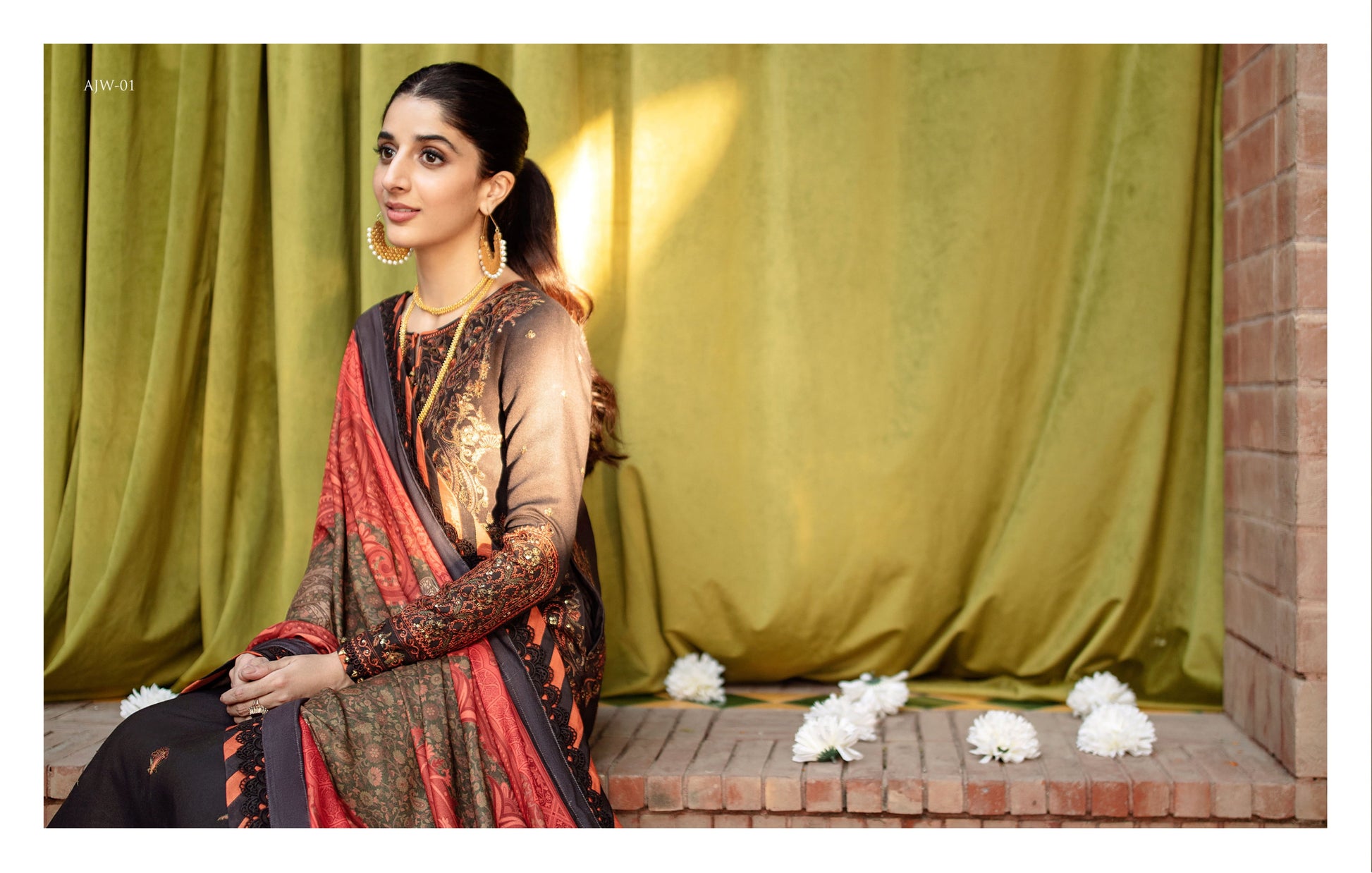 Mawra Hocane is a vision to behold clad in rich dark brown attire. Twill marina base is etched with rust and green thread work punctuated by golden sequins crafted with pockets to create a fitting silhouette for this winter. It comes with pashmina inspired printed shawl with solid dyed pants, elevating this design to another level.