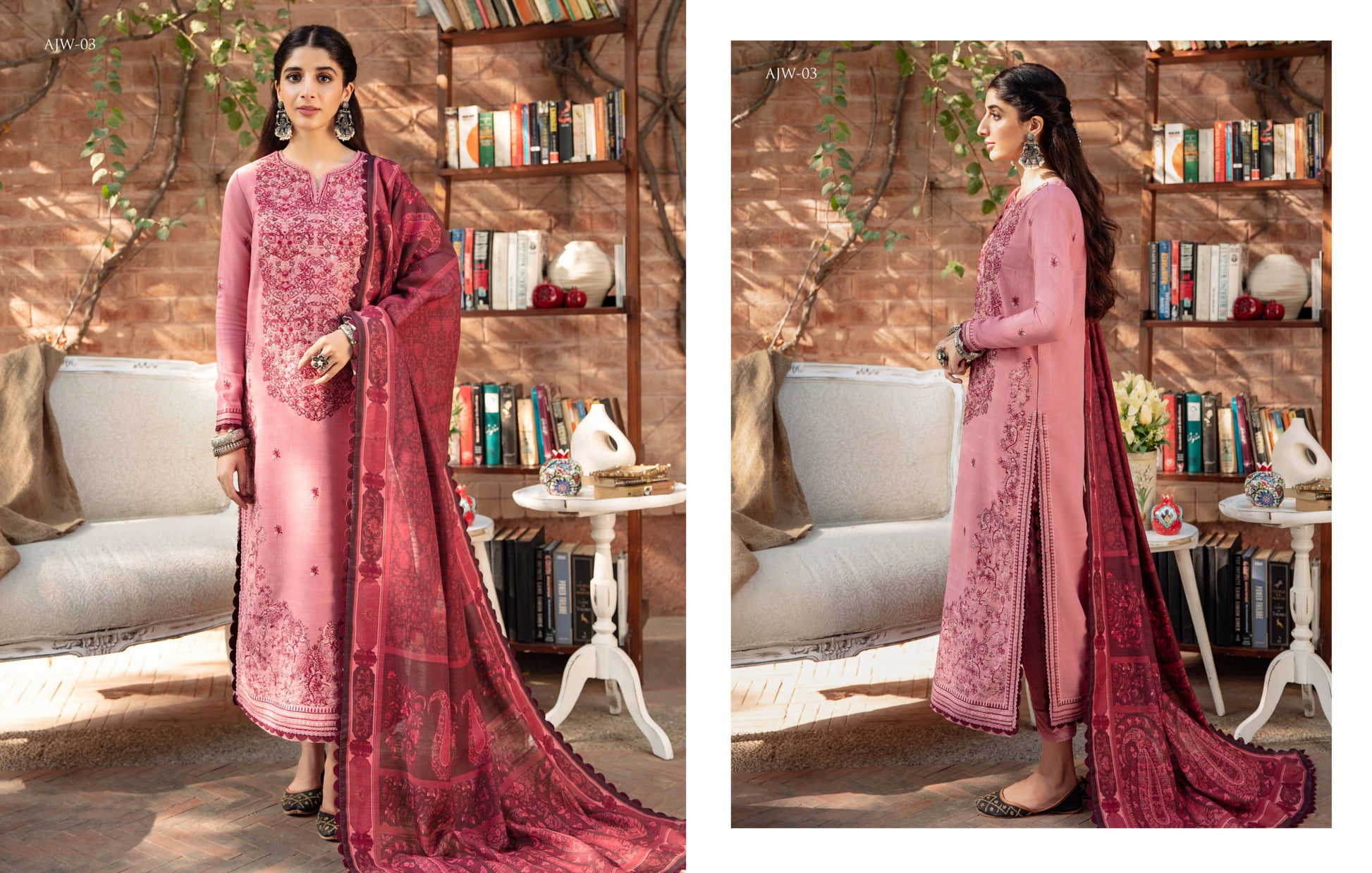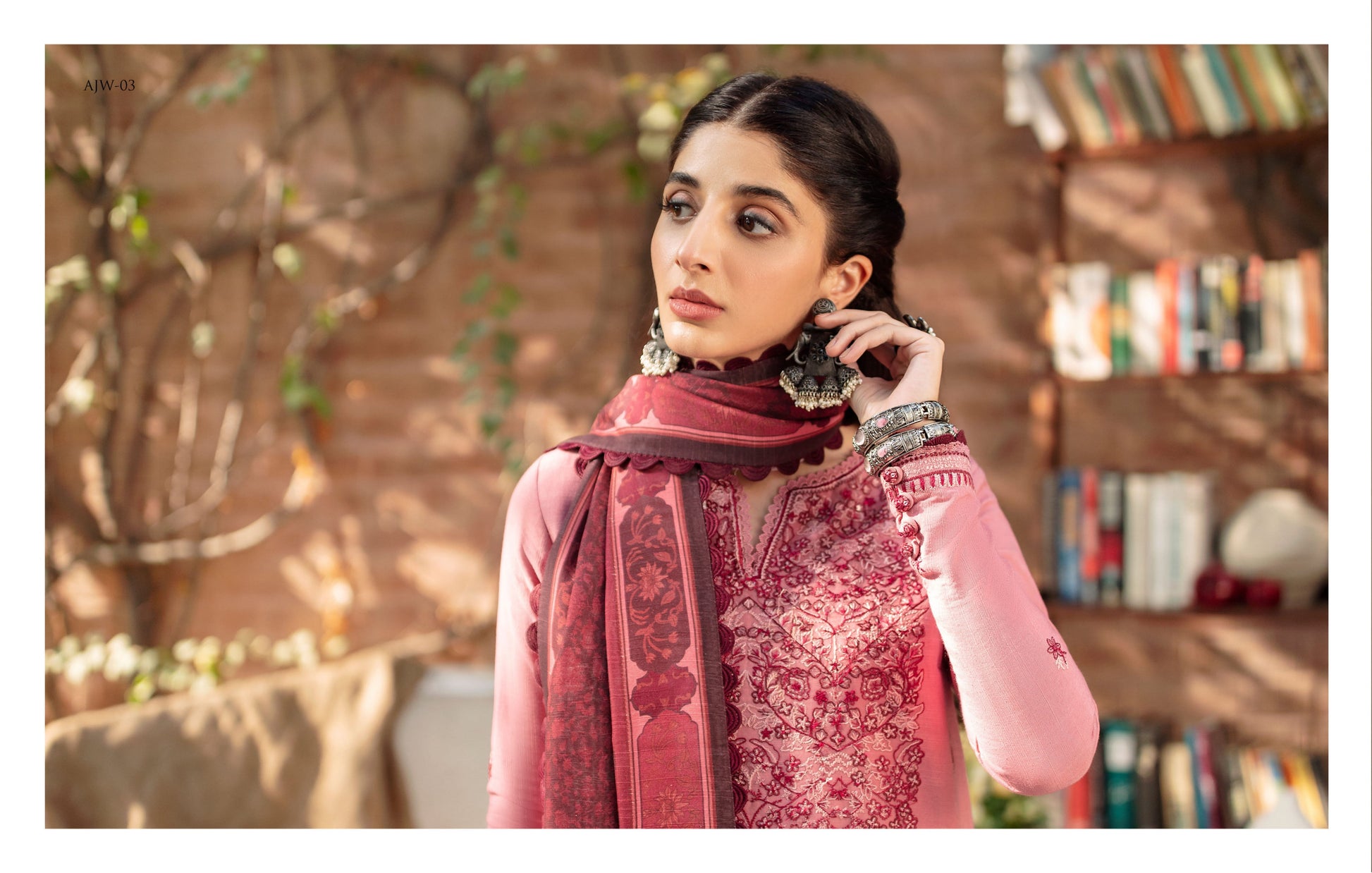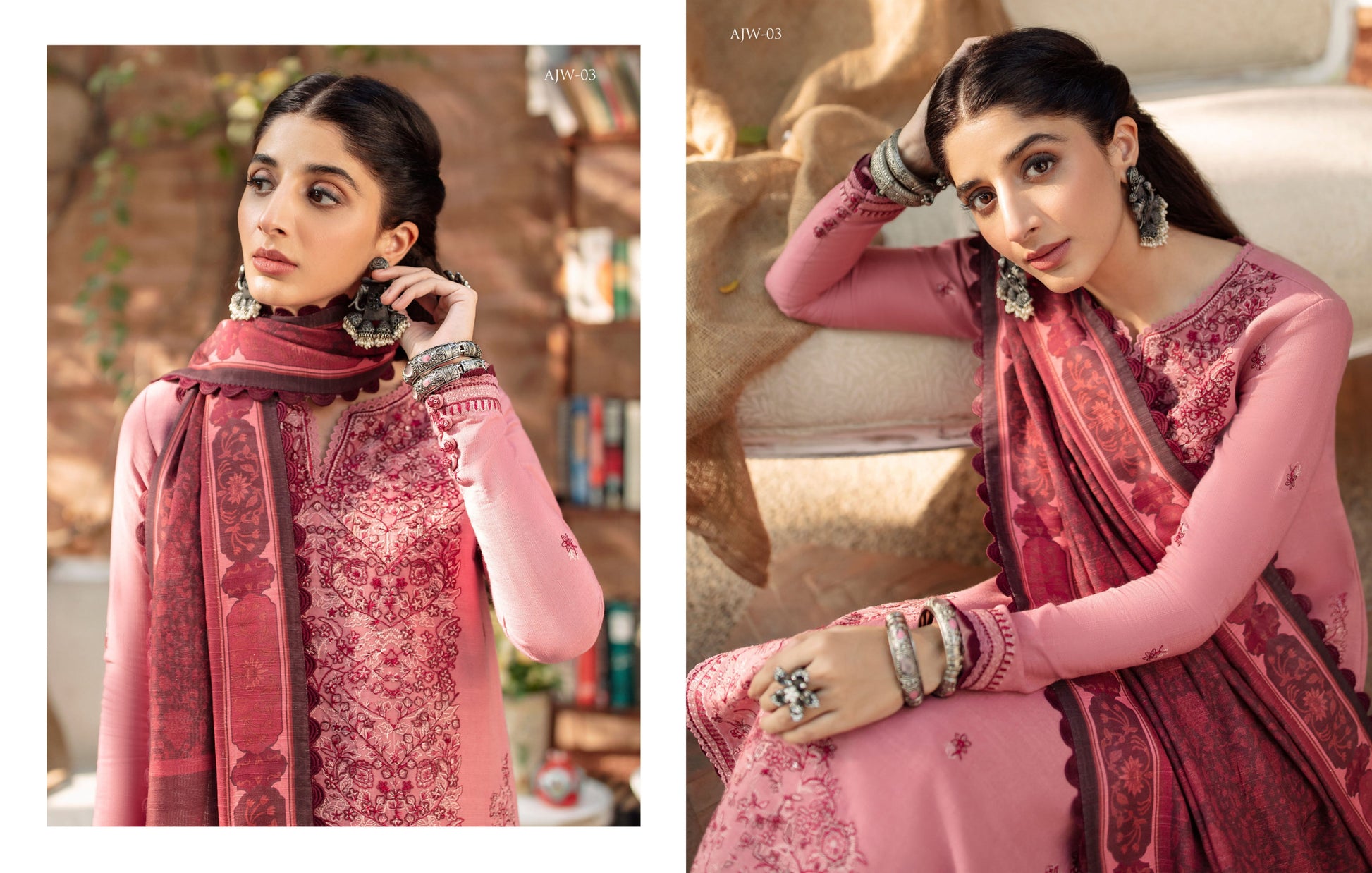 Mawra Hocane looks dainty garbed in this dusty pink outfit. A long shirt embroidered in deep maroon and pale pink thread coordinated by deep maroon printed shawl on khaddar is a timeless combination to add in your winter closet. It comes with dyed pants.