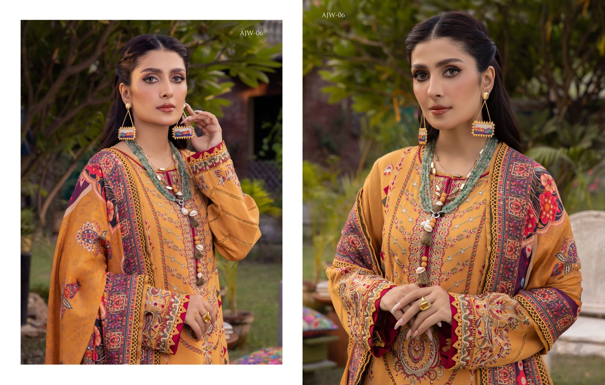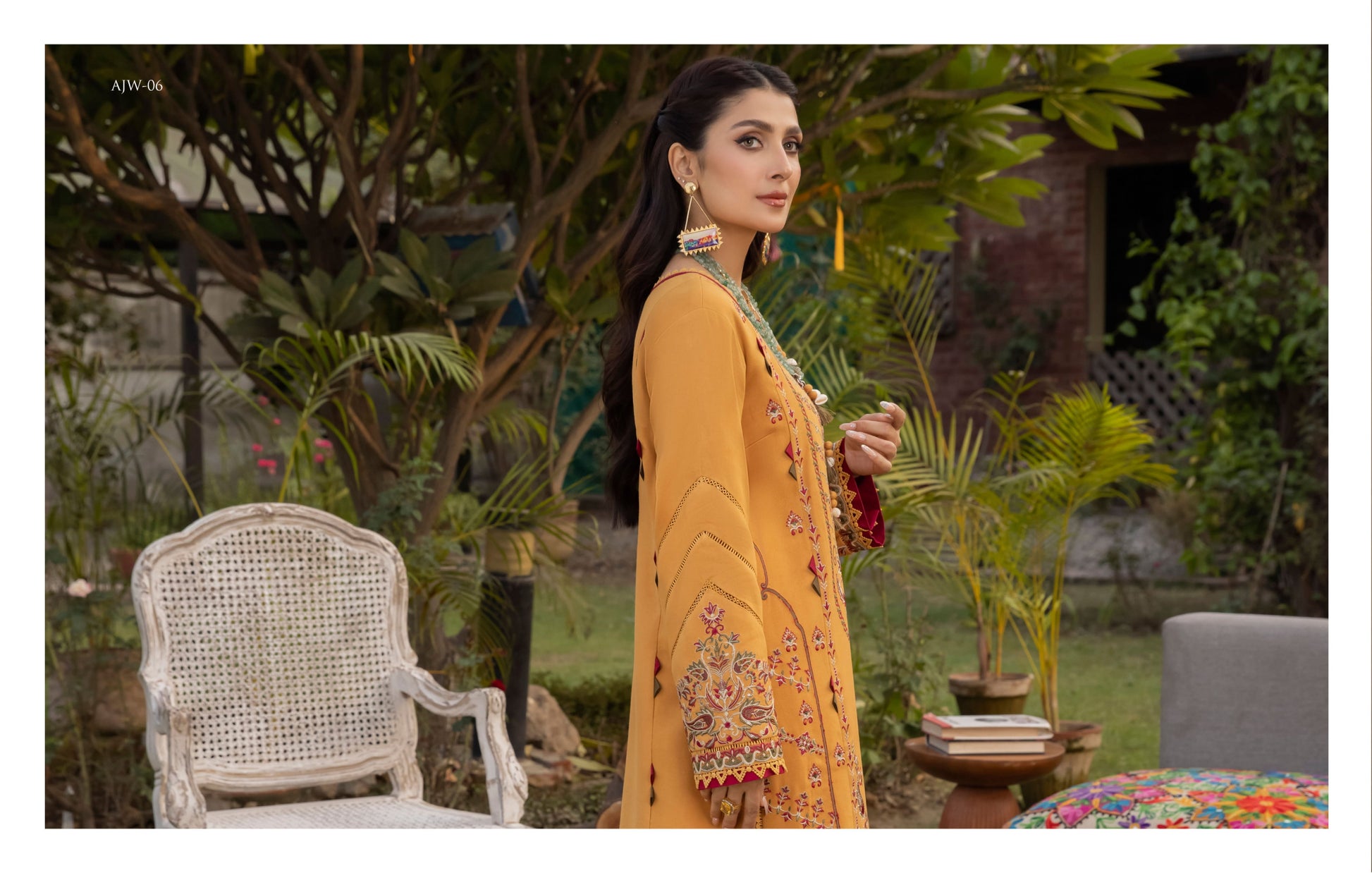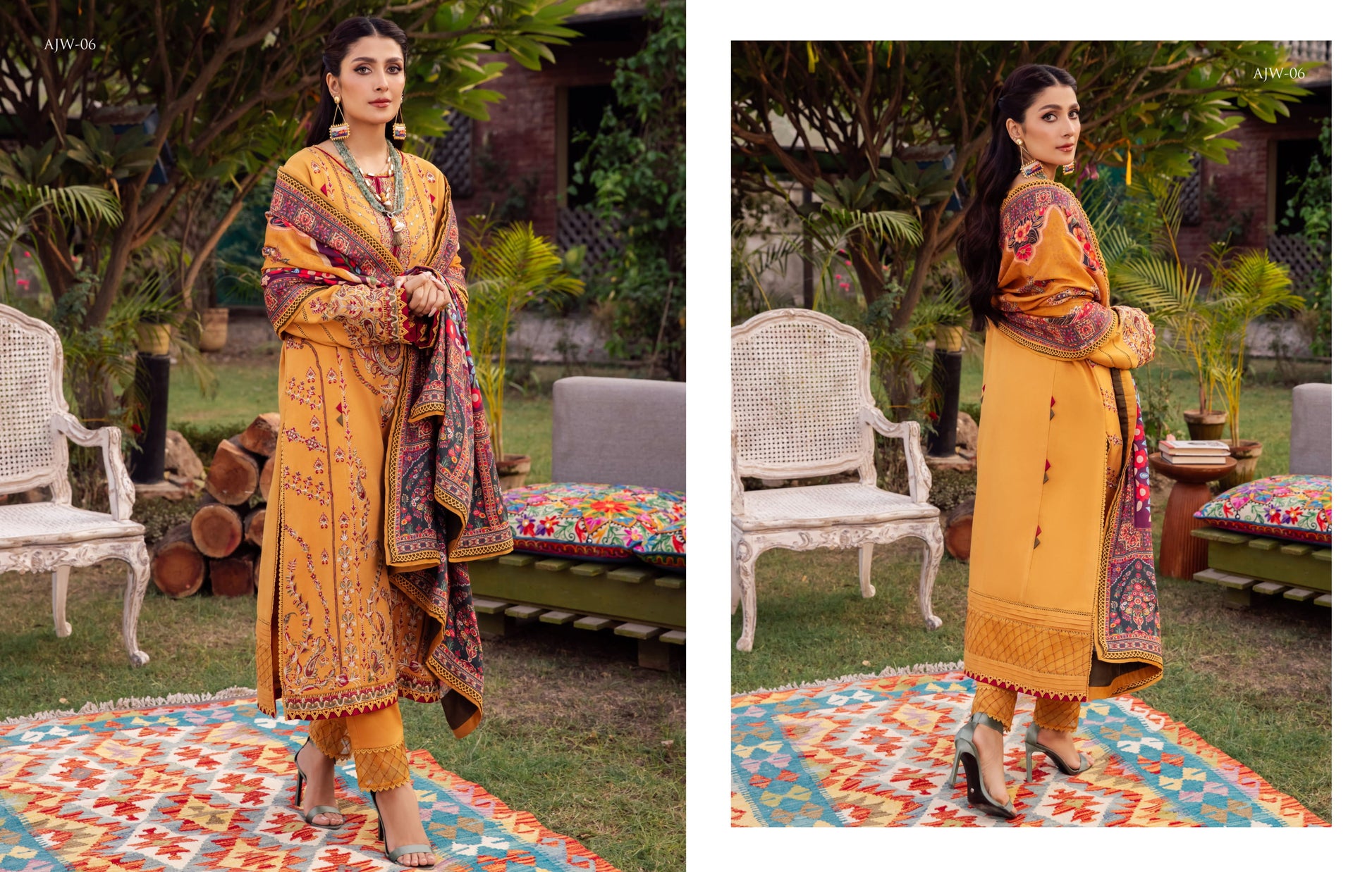 Ayeza Khan is garbed in true rich autumn colours with honey mustard base reminiscent of the golden winter sun and dry leaves decorated with magenta and leaf green and beige paired with a statement printed shawl, making this design a must have for this winter.