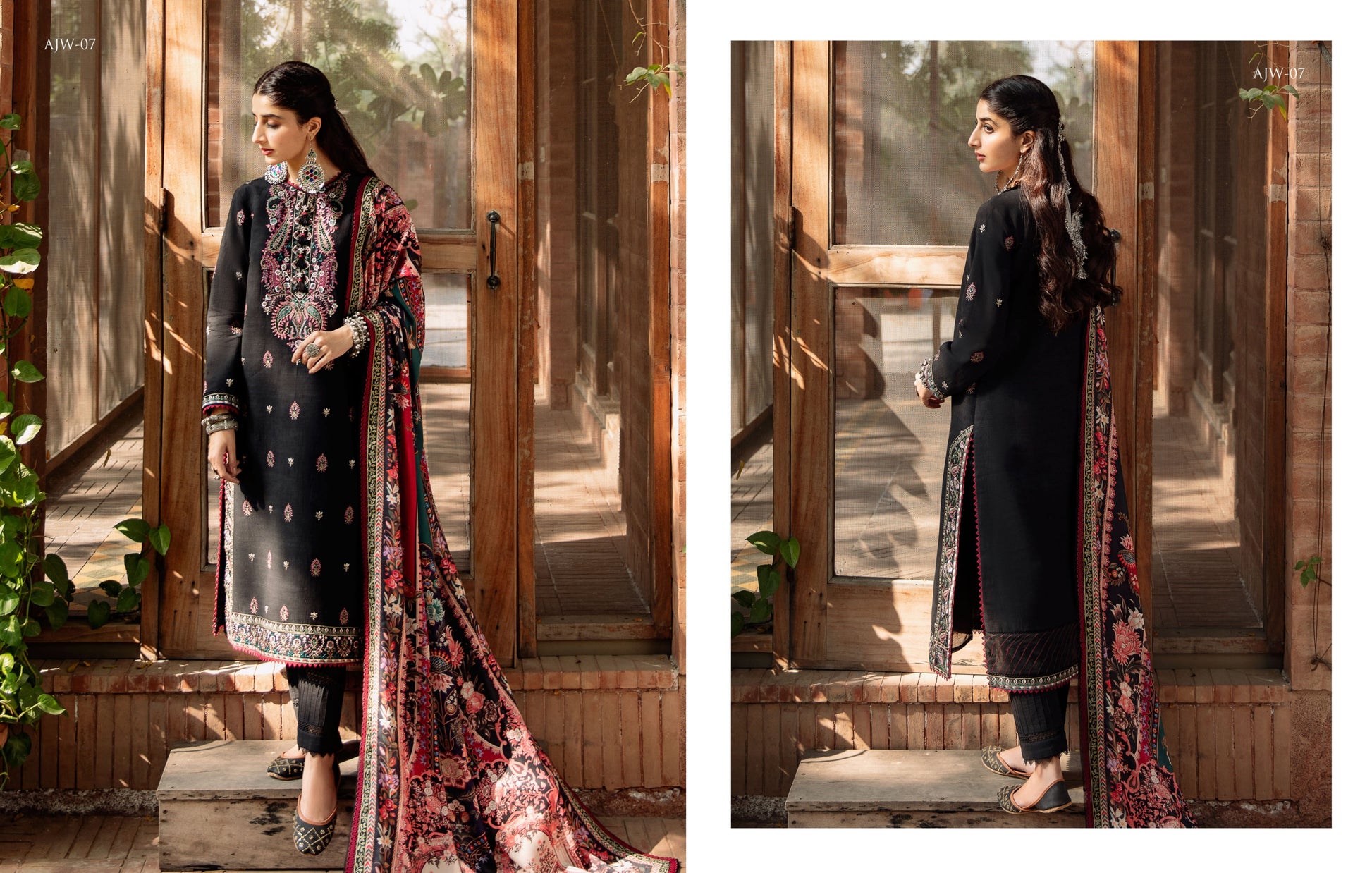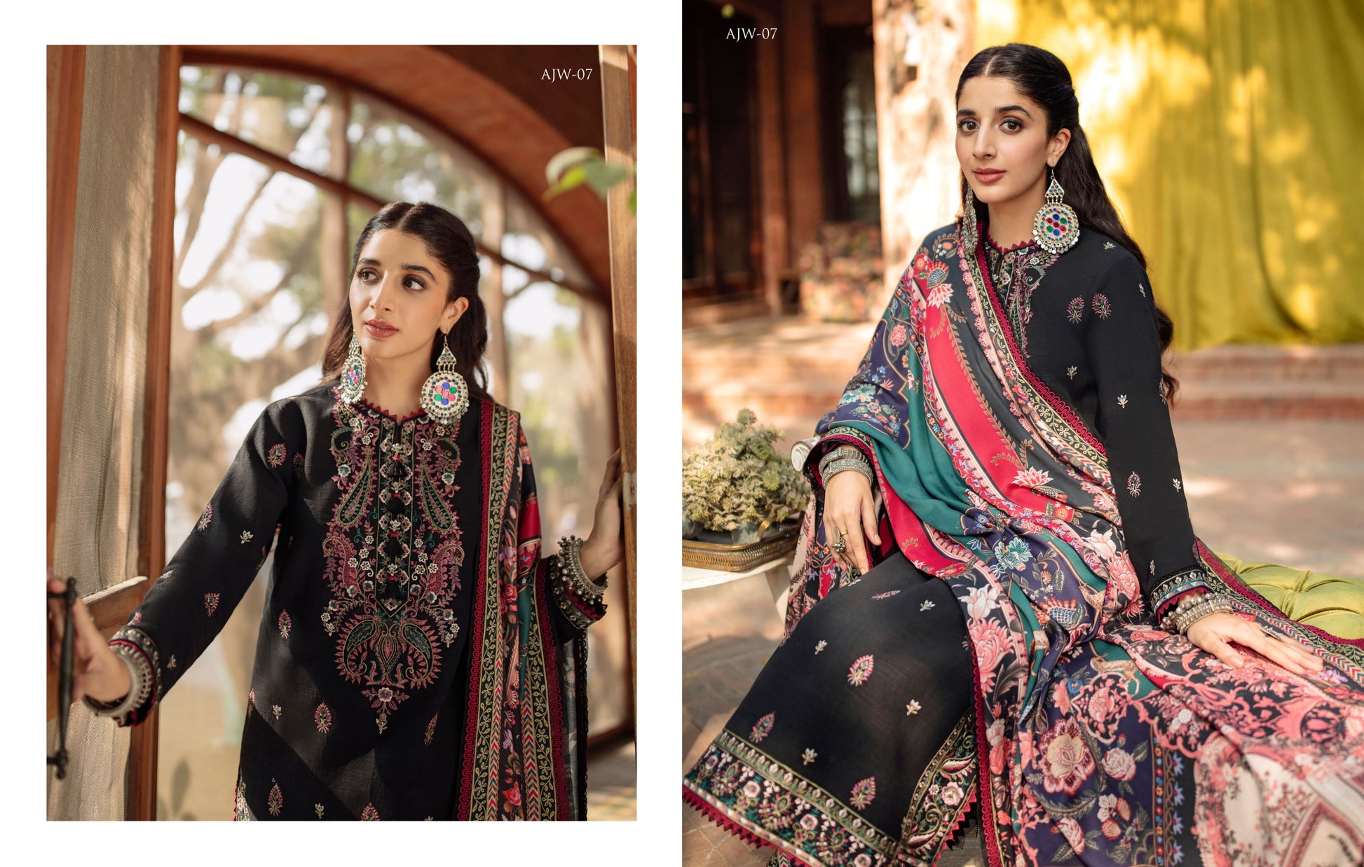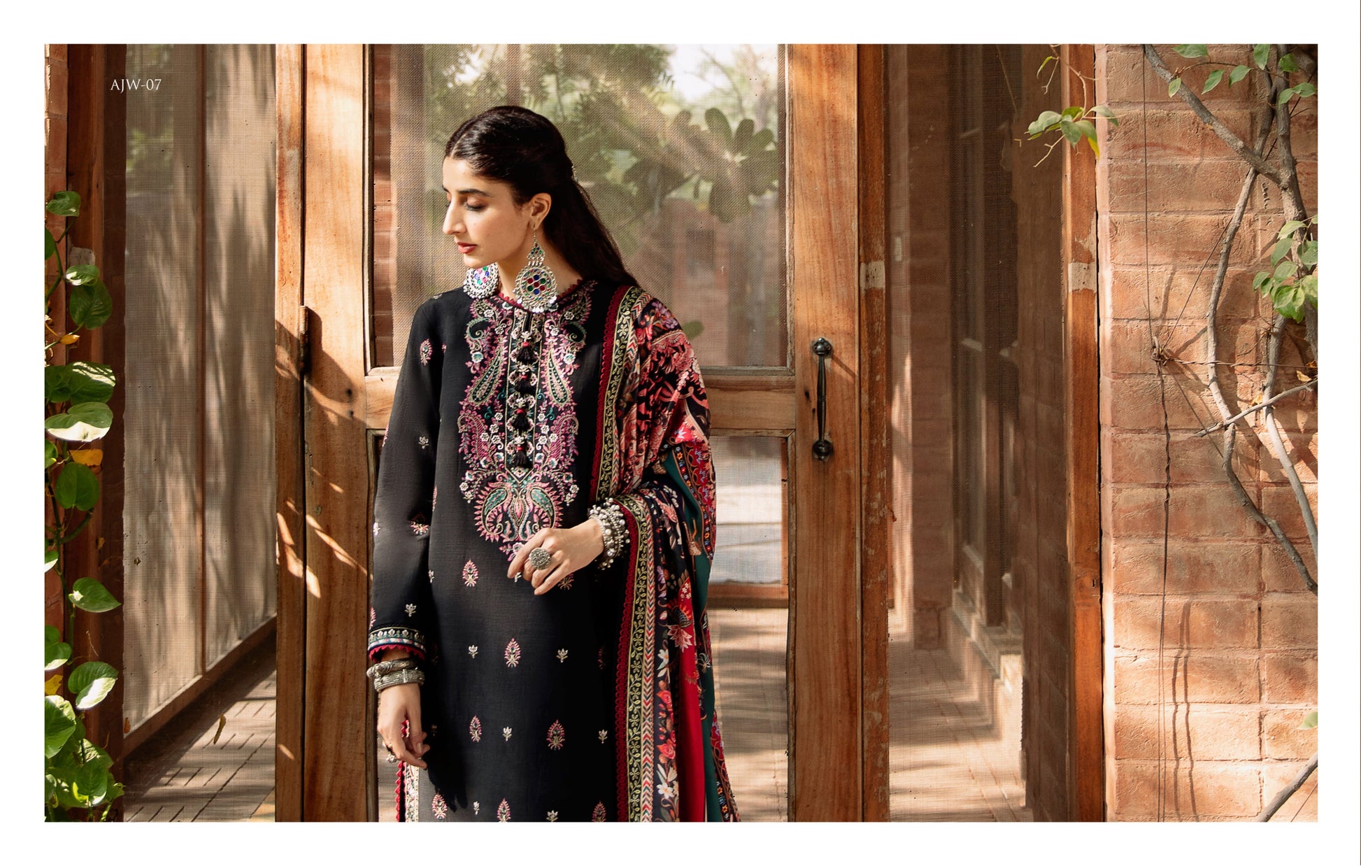 Giving off tribal vibes Mawra Hocane rocks a traditional look in this stunning black khaddar design. A muted colour palette consisting of deep purple, teal and pink thread work with sprinkling of black sequins glints with each turn. It comes with an elaborately printed shawl and solid dyed pants.