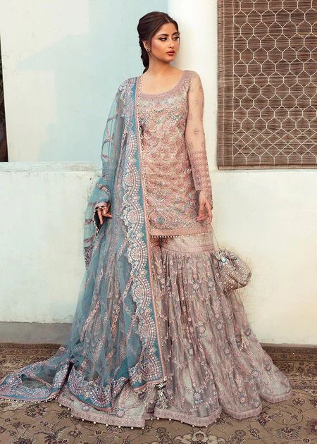 Aytan is a testament to the timeless allure of heirloom pieces. Handcrafted by top-tier artisans with expert know-how of each technique, this graceful net shirt and its sweeping gharara come sublimely ornamented with resham, tilla and sequins. The captivating tea-pink hue and embroidered net dupatta further add to the fairytale charm of the enchanting ensemble.