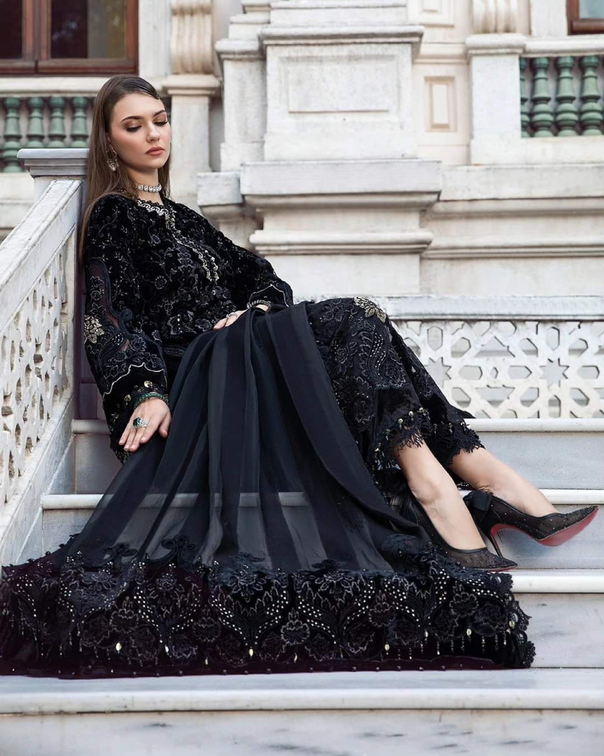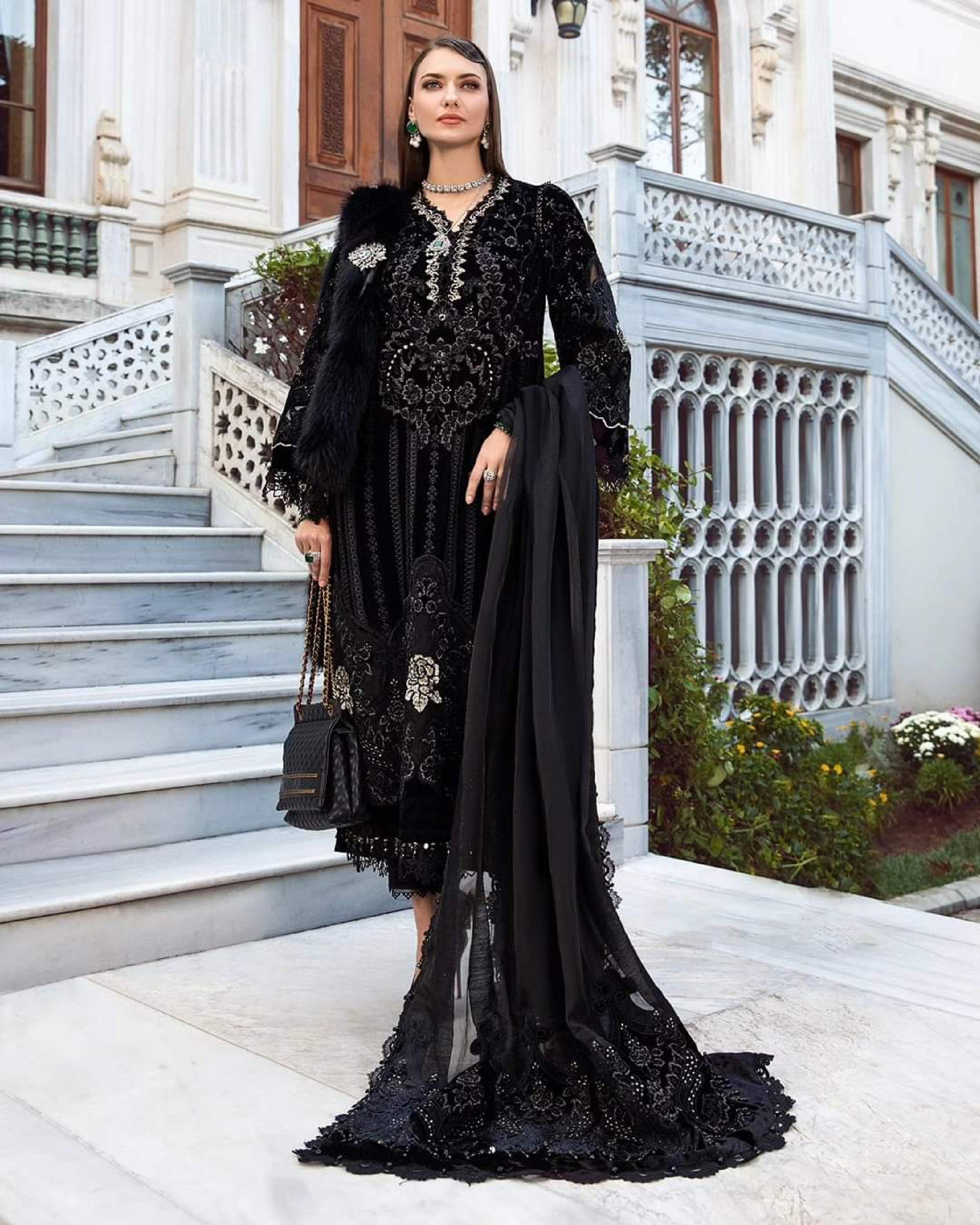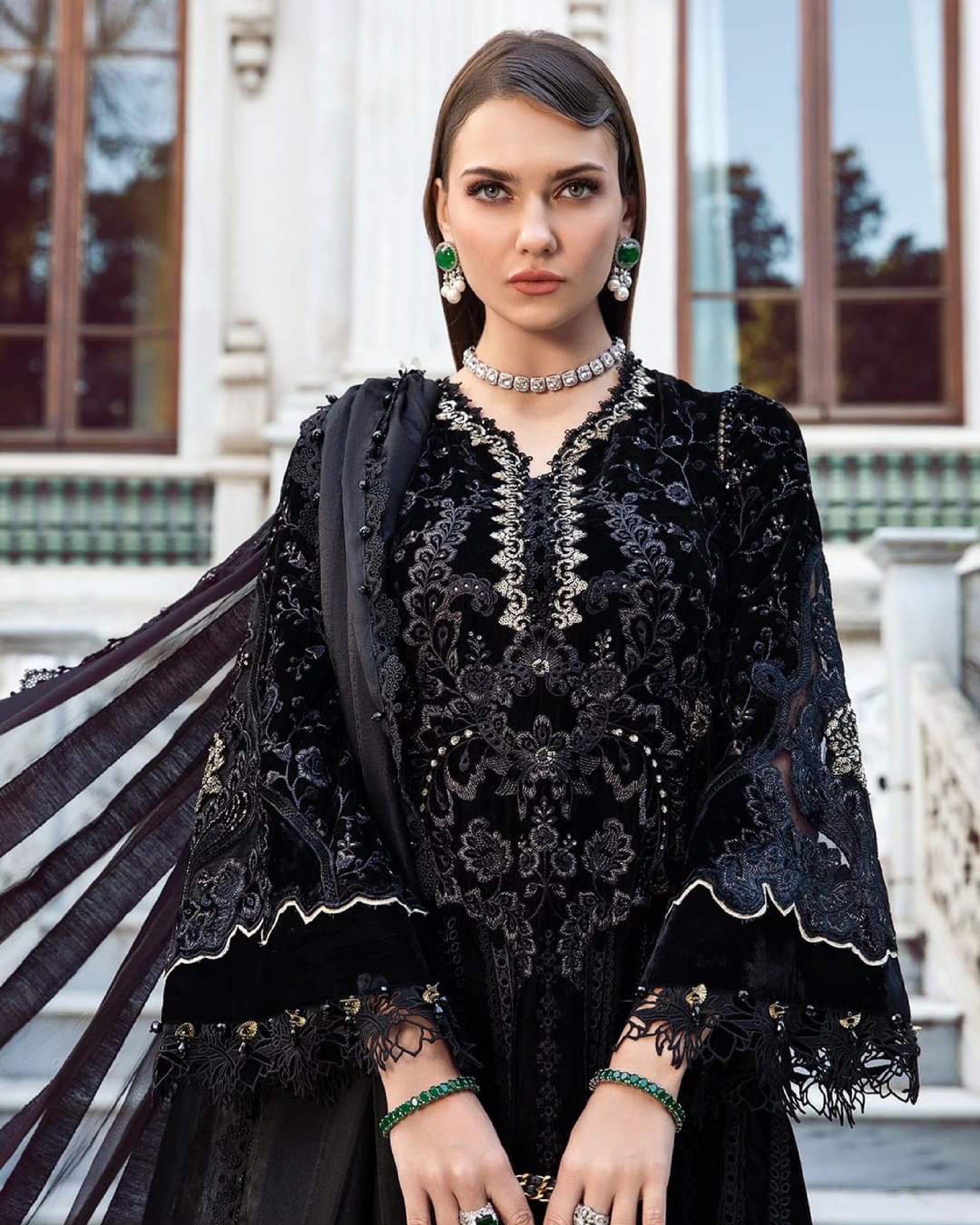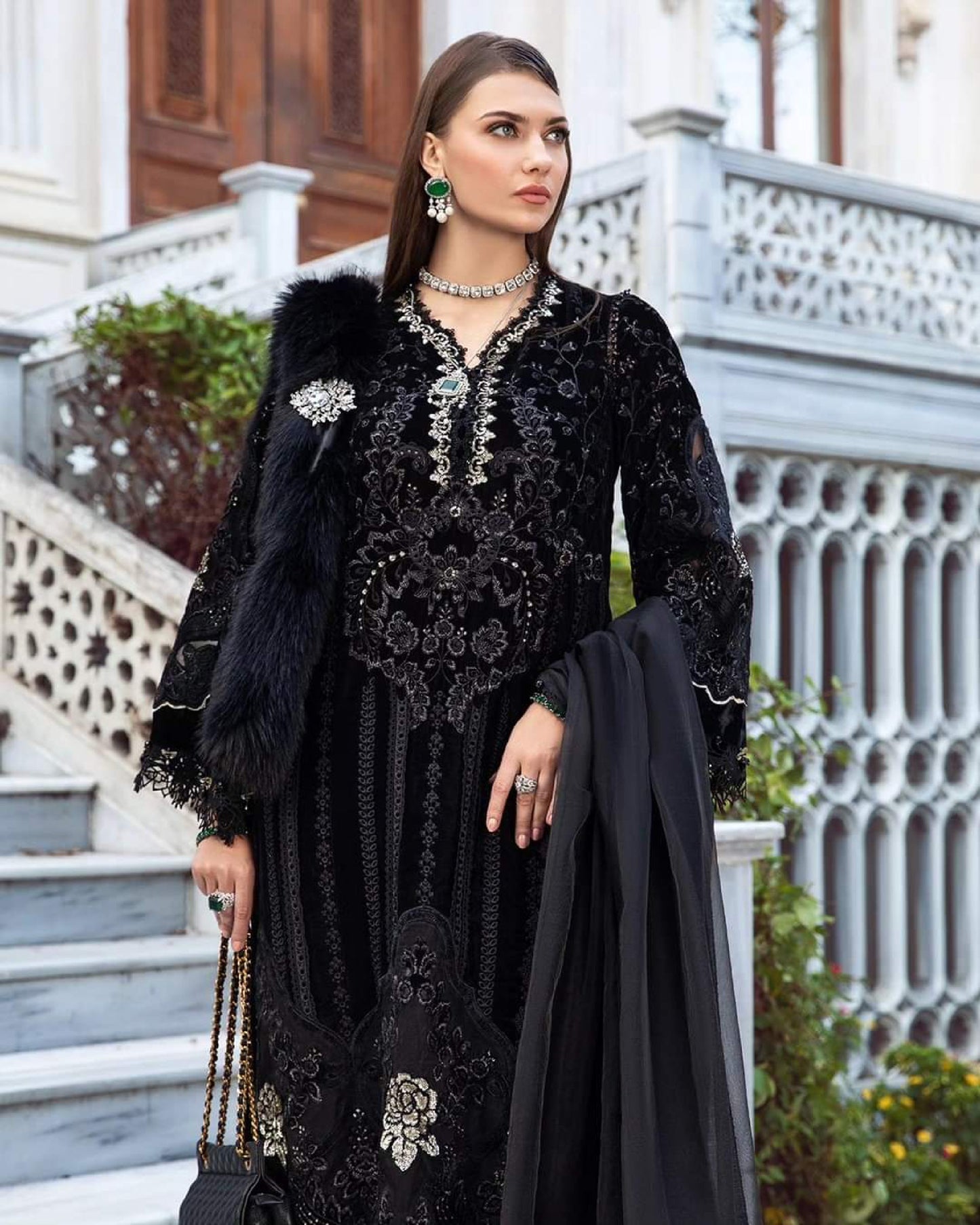 This dress is a melange of class and elegance, featuring an embroidered shirt framed with velvet applique and paired with embroidered dupatta and dyed trousers.