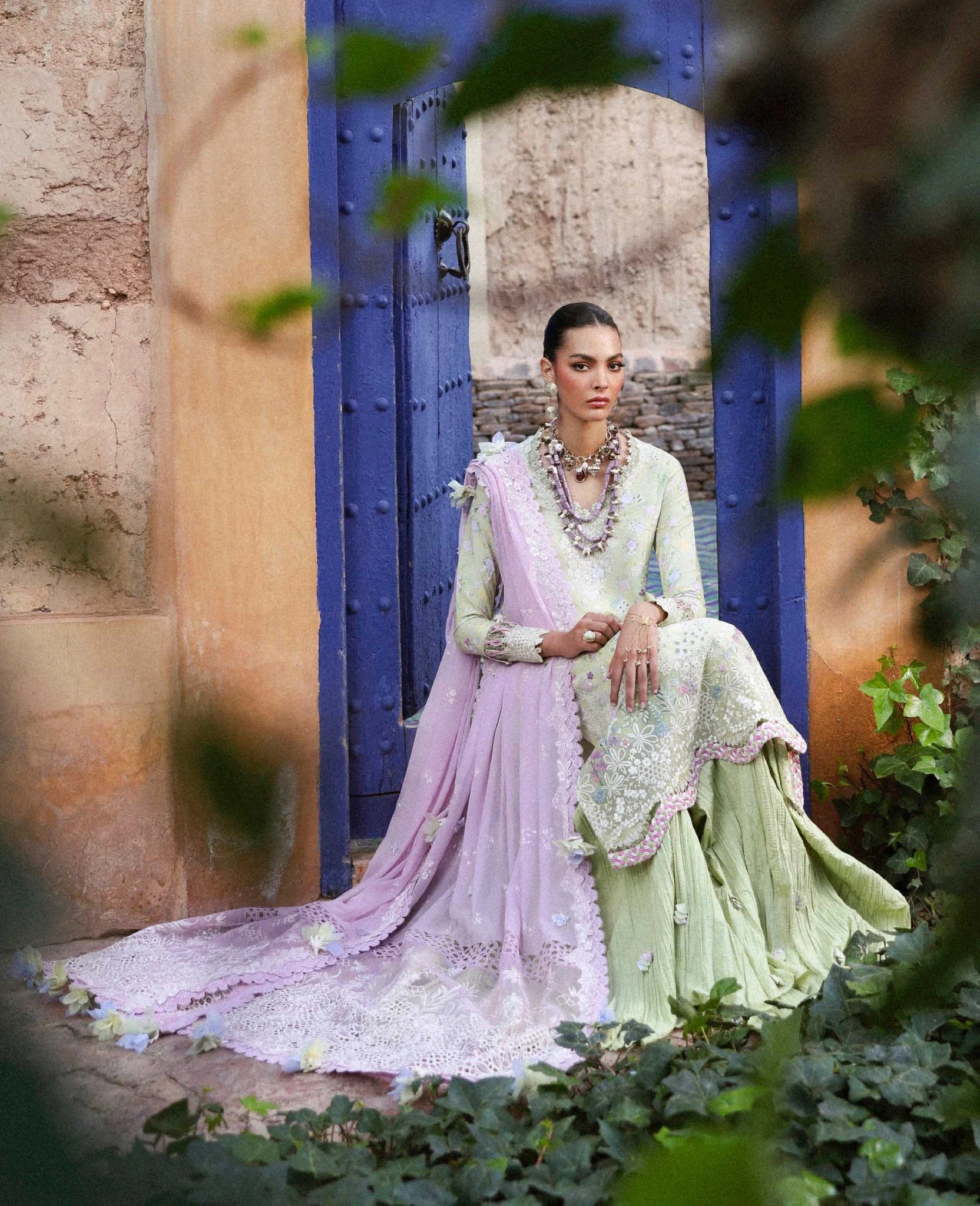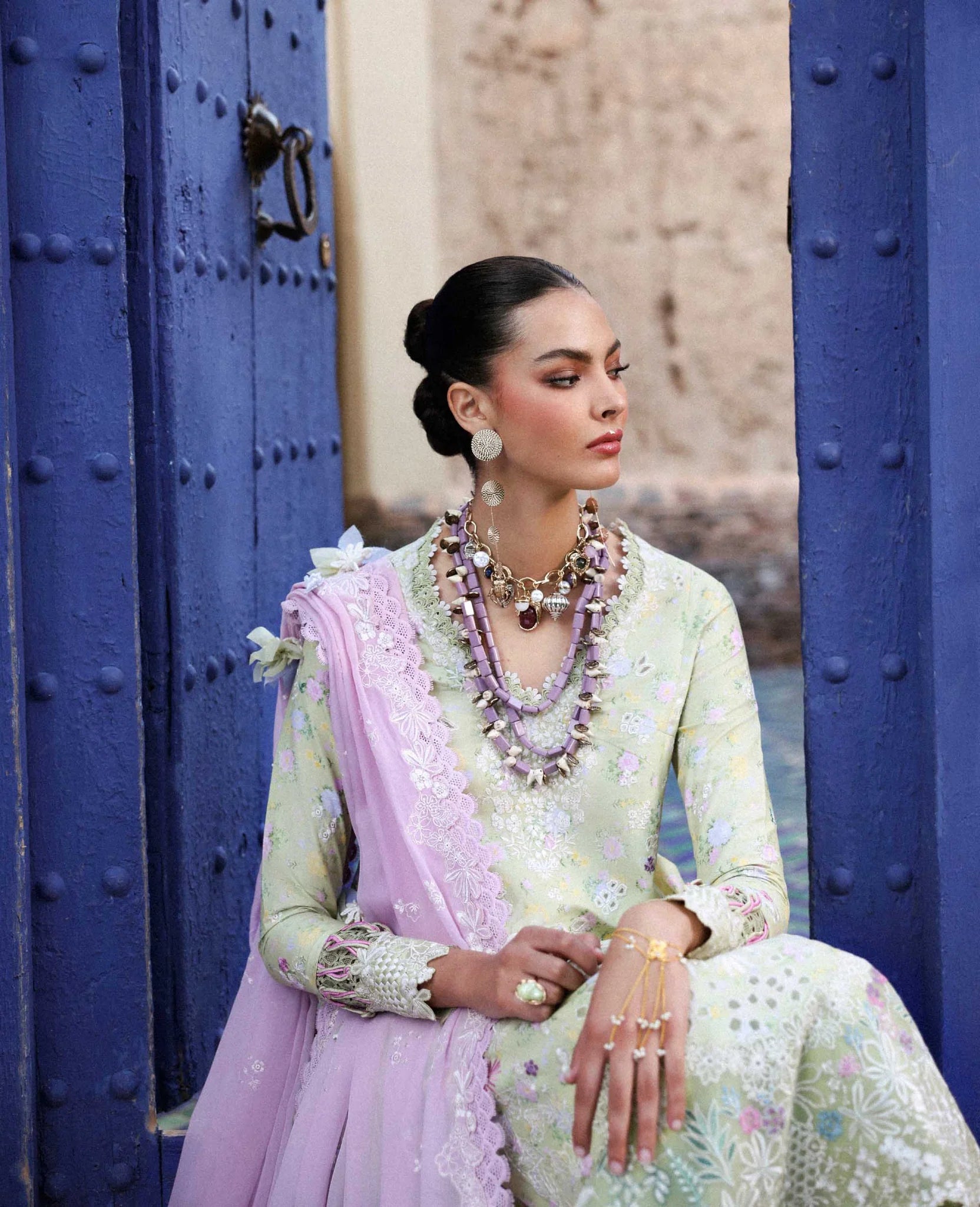 This three-panel apple green shirt combines floral prints with intricate embroidery, featuring a central laser-cut and boring panel in harmonious shades of pink, green, and blue, lightly accented with cream. The hem is thoughtfully bordered with subtle shikargah and botanical motifs, tying the design together gracefully. Sleeves are adorned with delicate floral sprays and finished with an organza border, paired with a flowing lilac chiffon dupatta featuring a contrast organza pallu with intricate boring technique. Completed with cambric trousers, this ensemble is airy, elegant, and perfect for Eid celebrations.