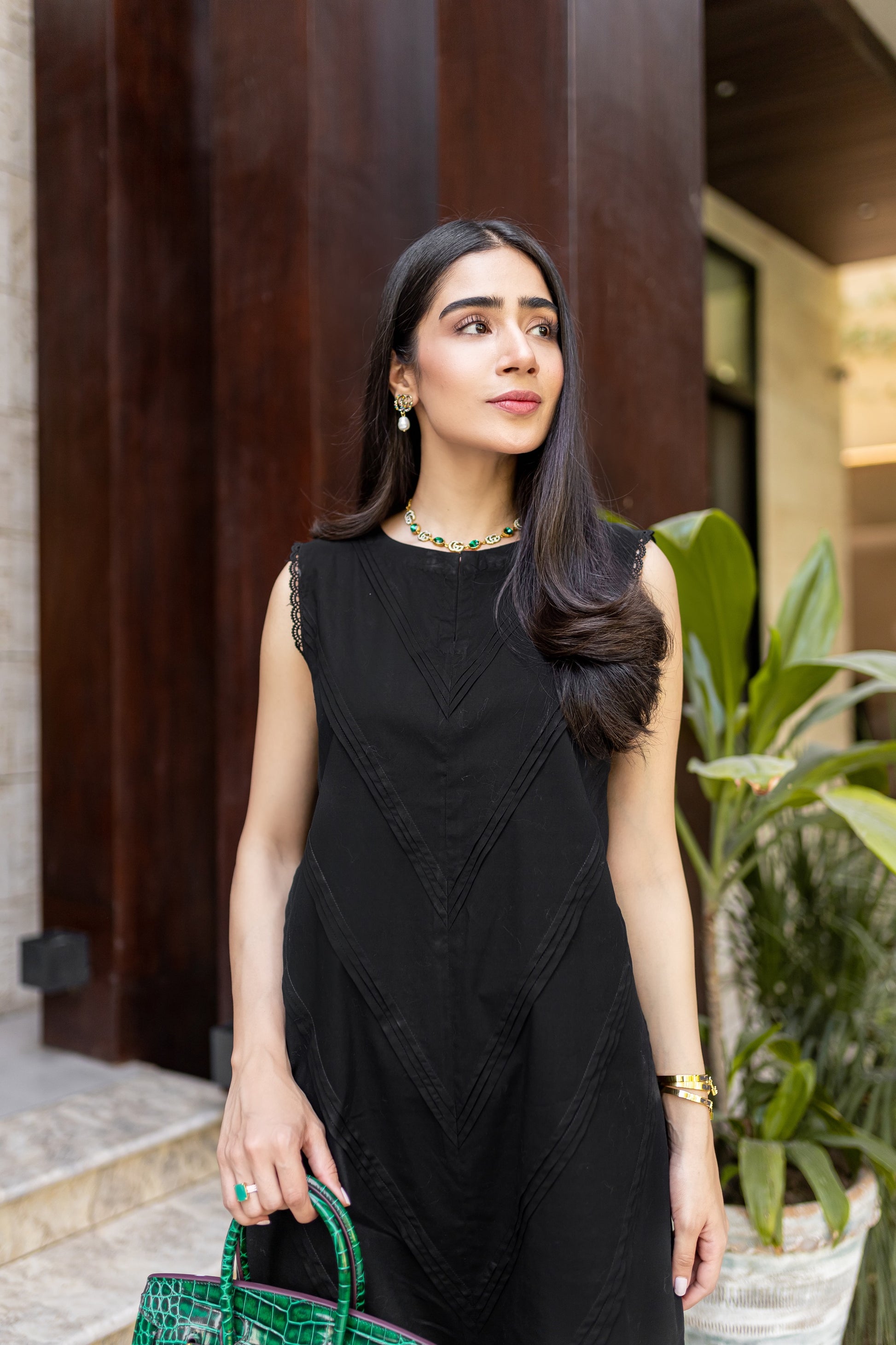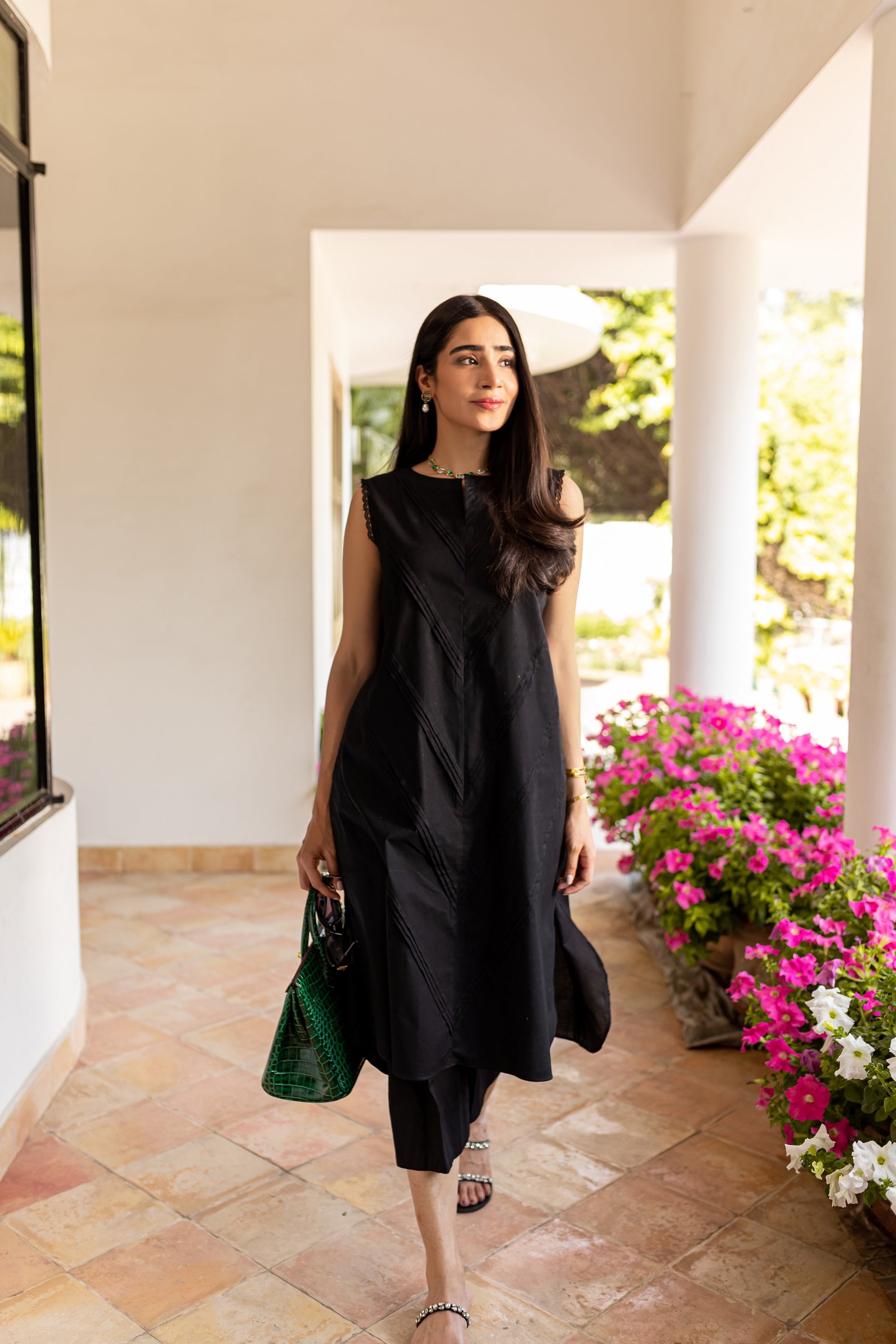 Description: A black cotton shirt stitched in loose cut, with diagonal pleat detail. Pairs perfectly with wide-legged crops.