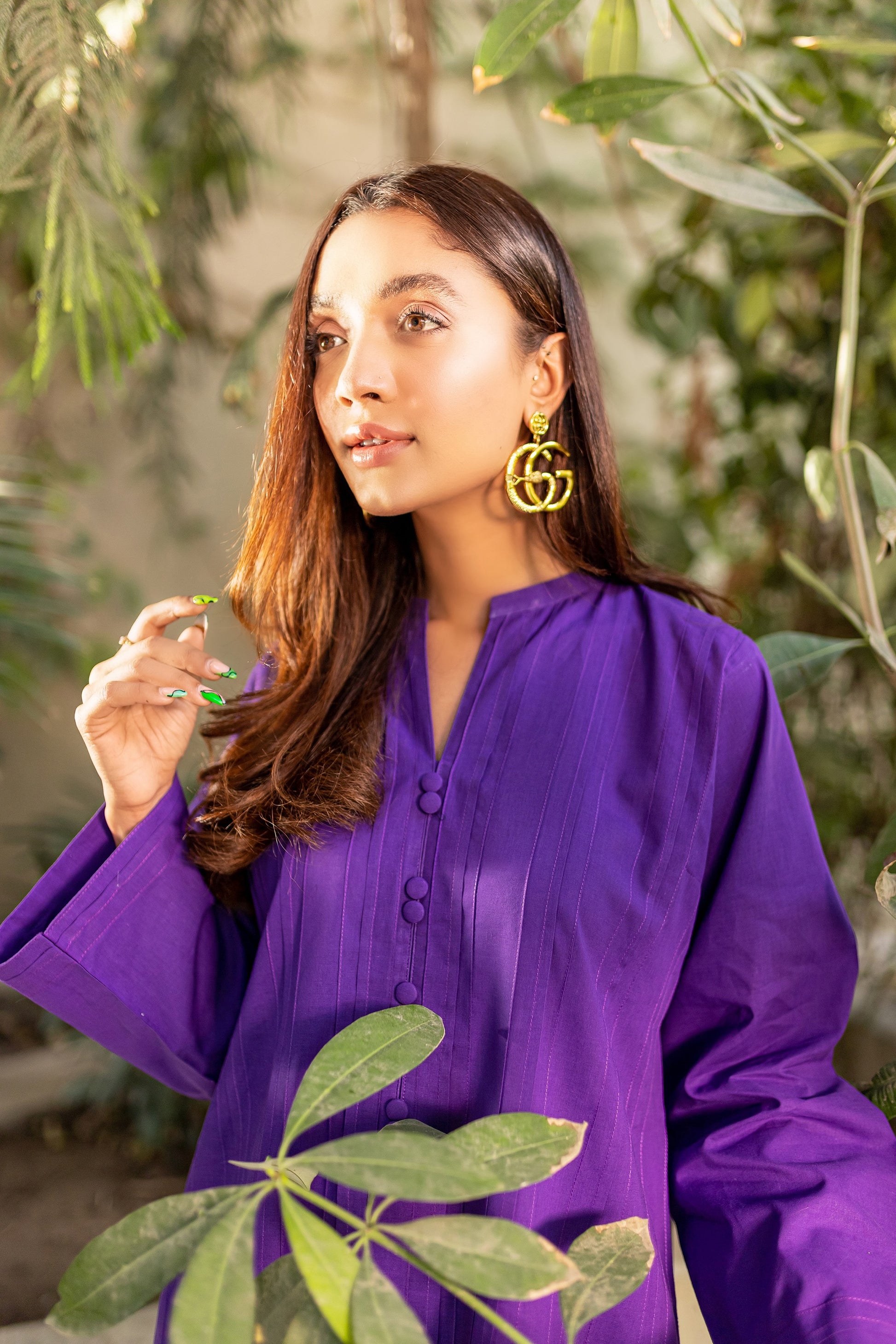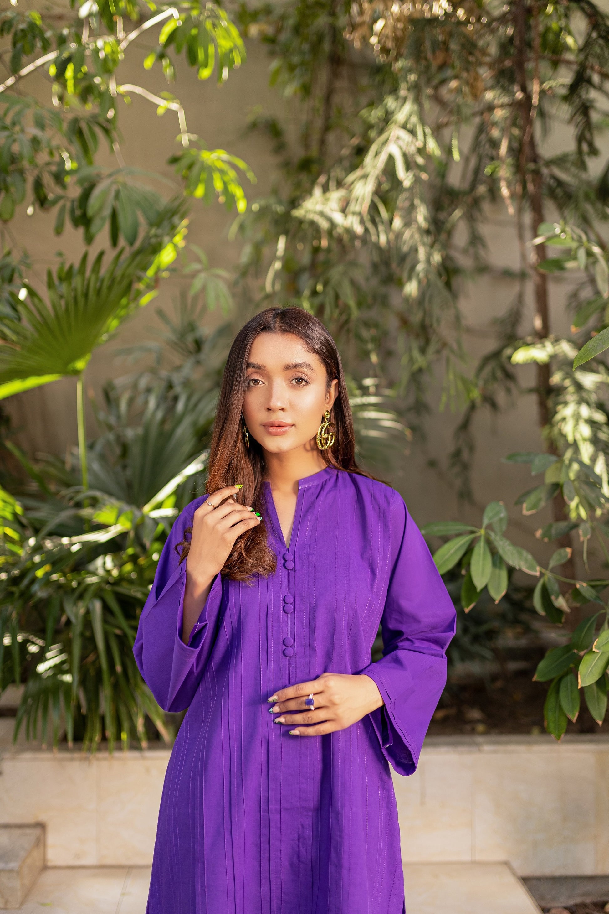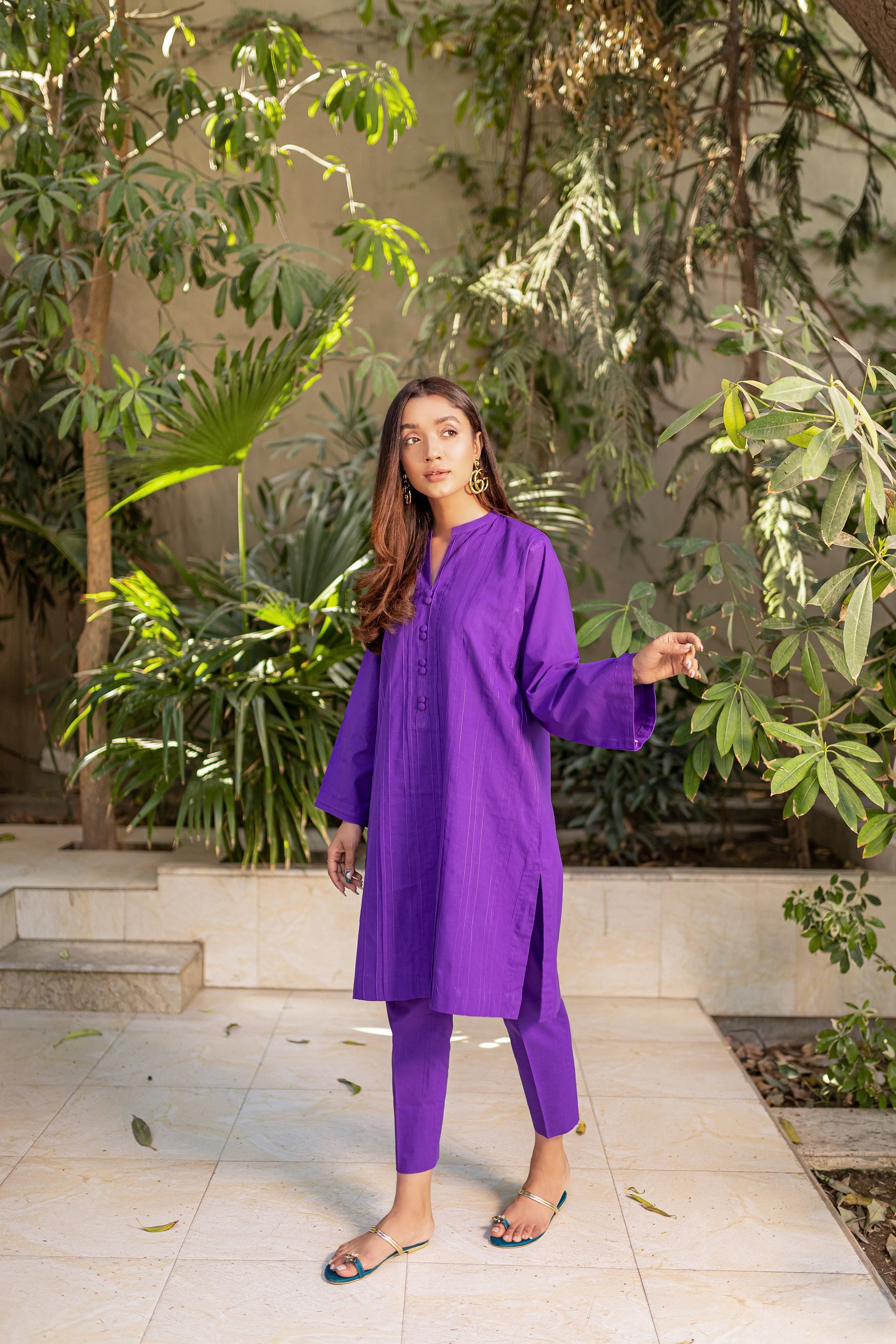 Description: A vivid purple knee-length straight cut Kurta on premium lawn, stitched with pleat & Pintuck details. It is paired with ankle length slim pants.