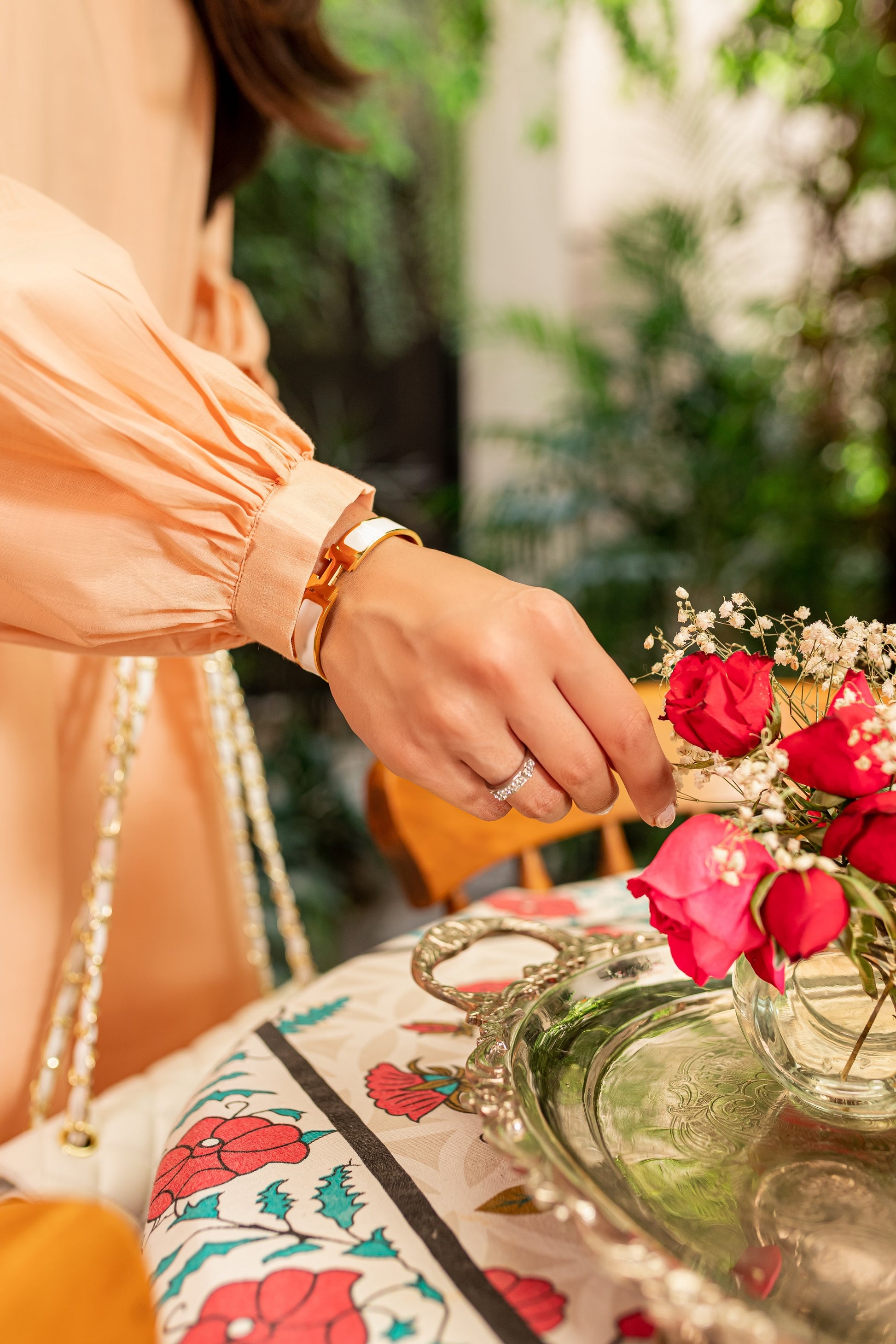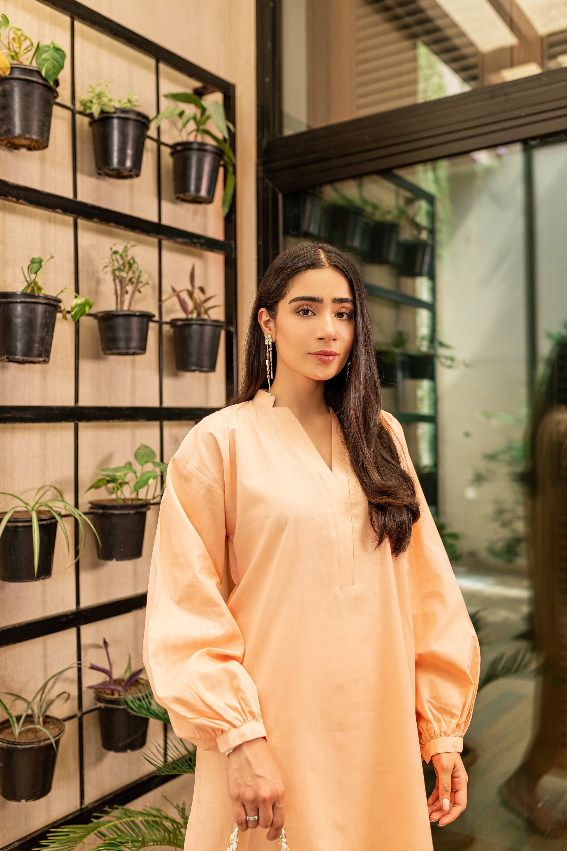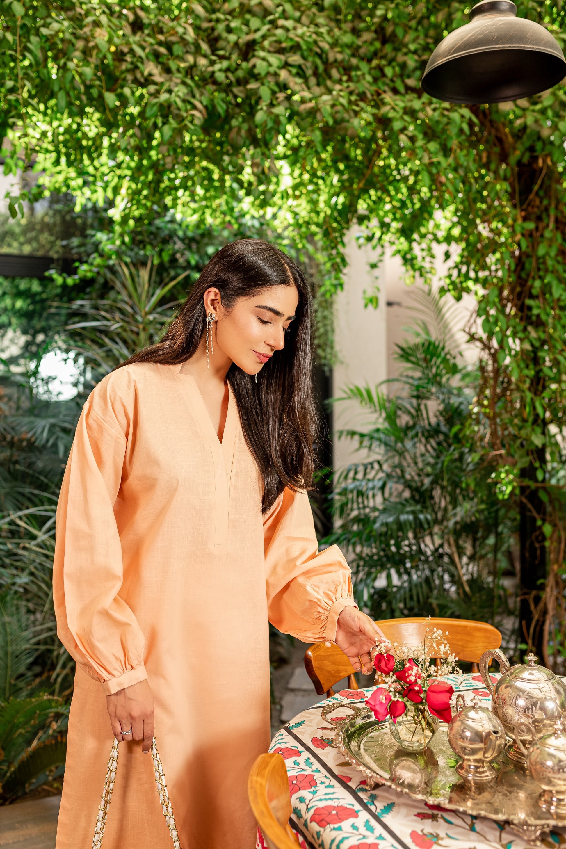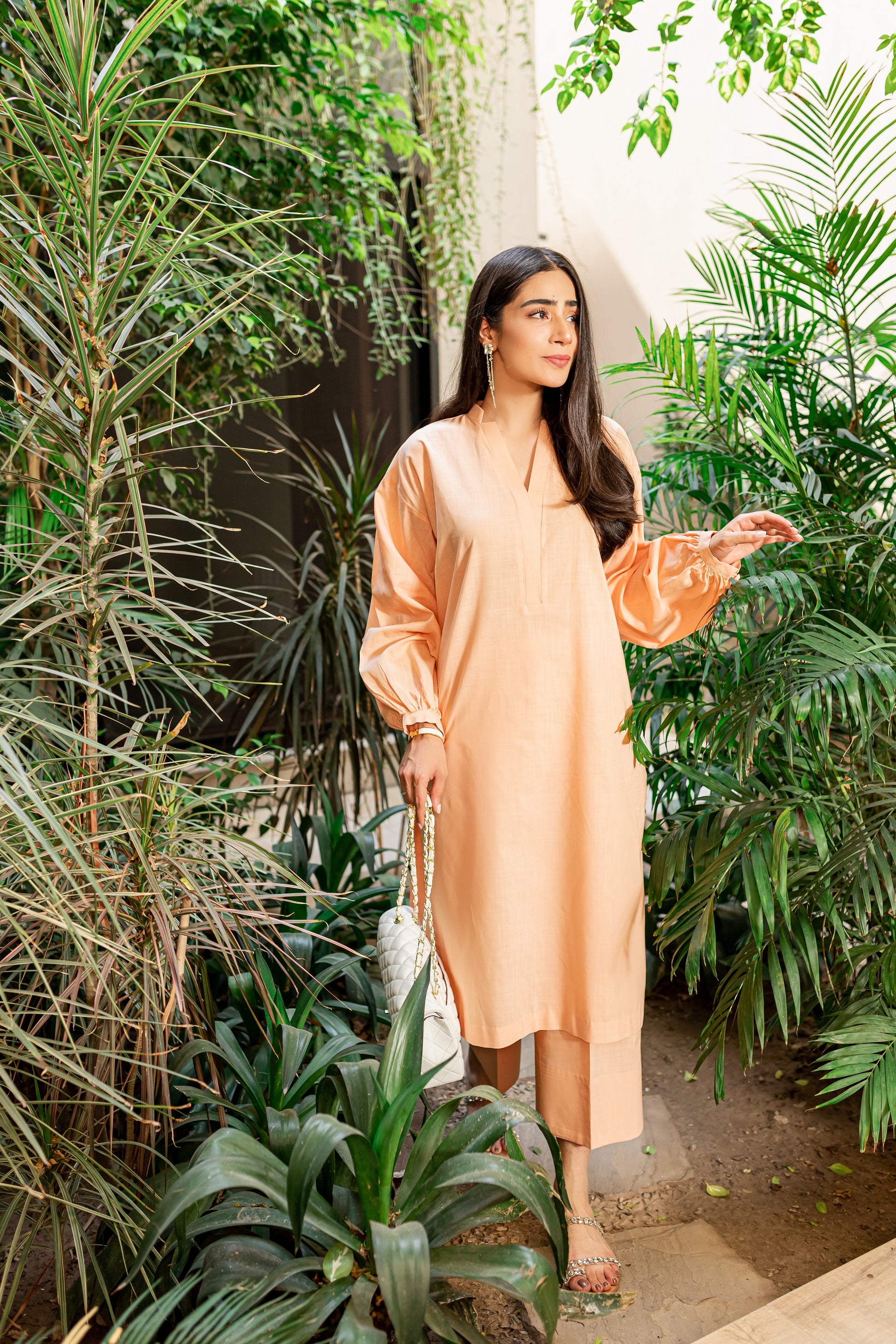 Description: A peach two piece set in self-textured lawn, neatly tailored for a crisp summer look.