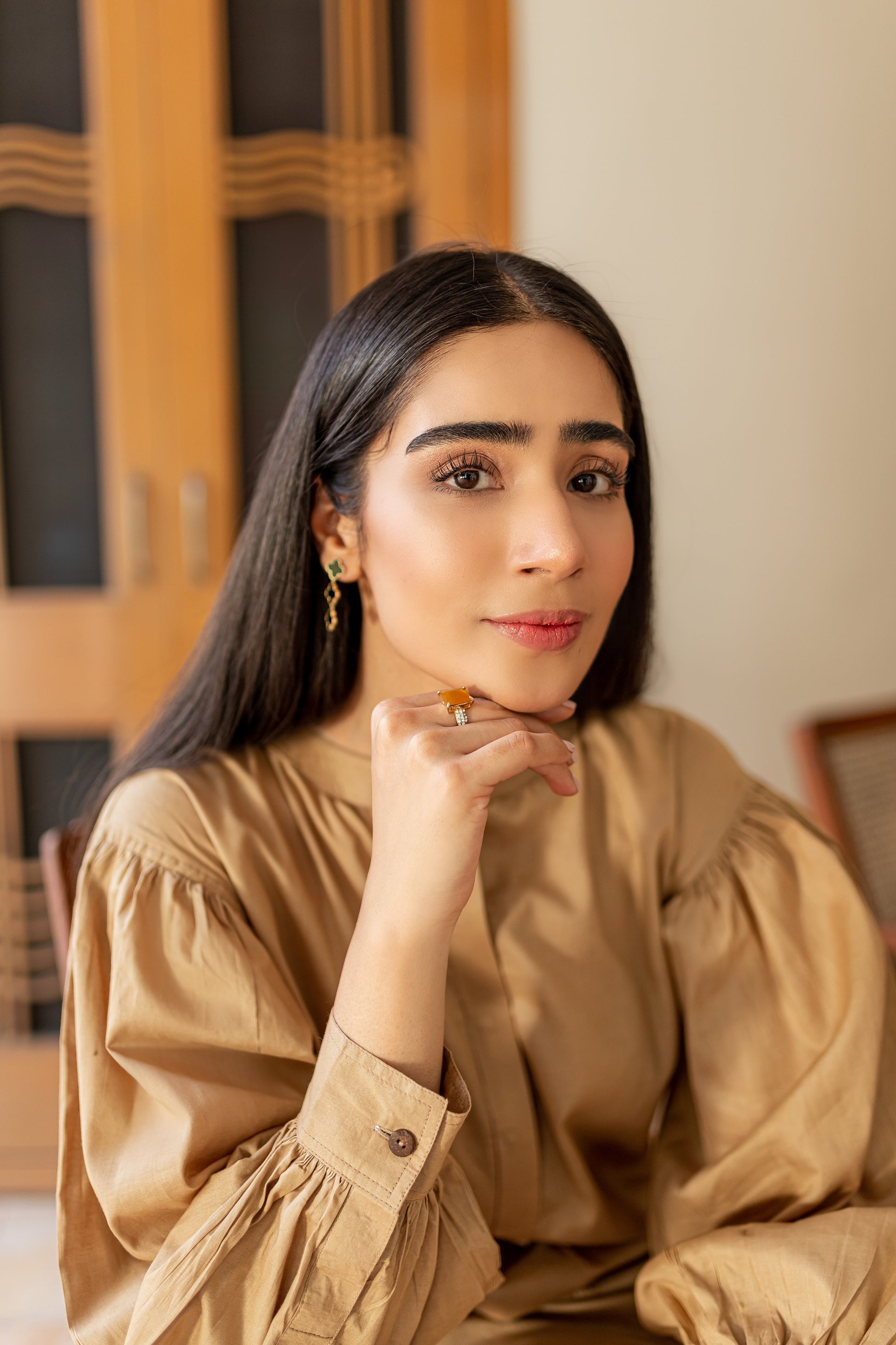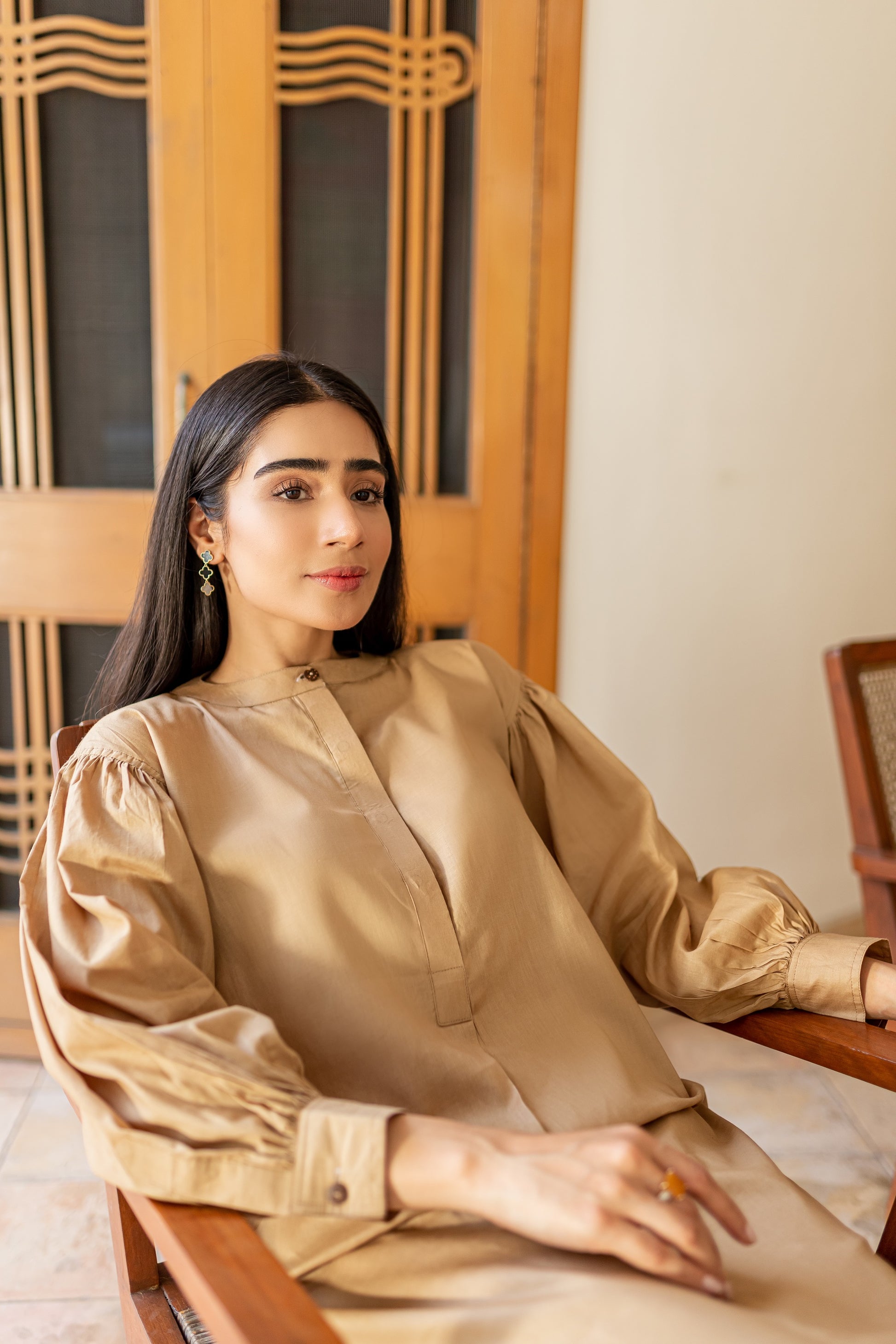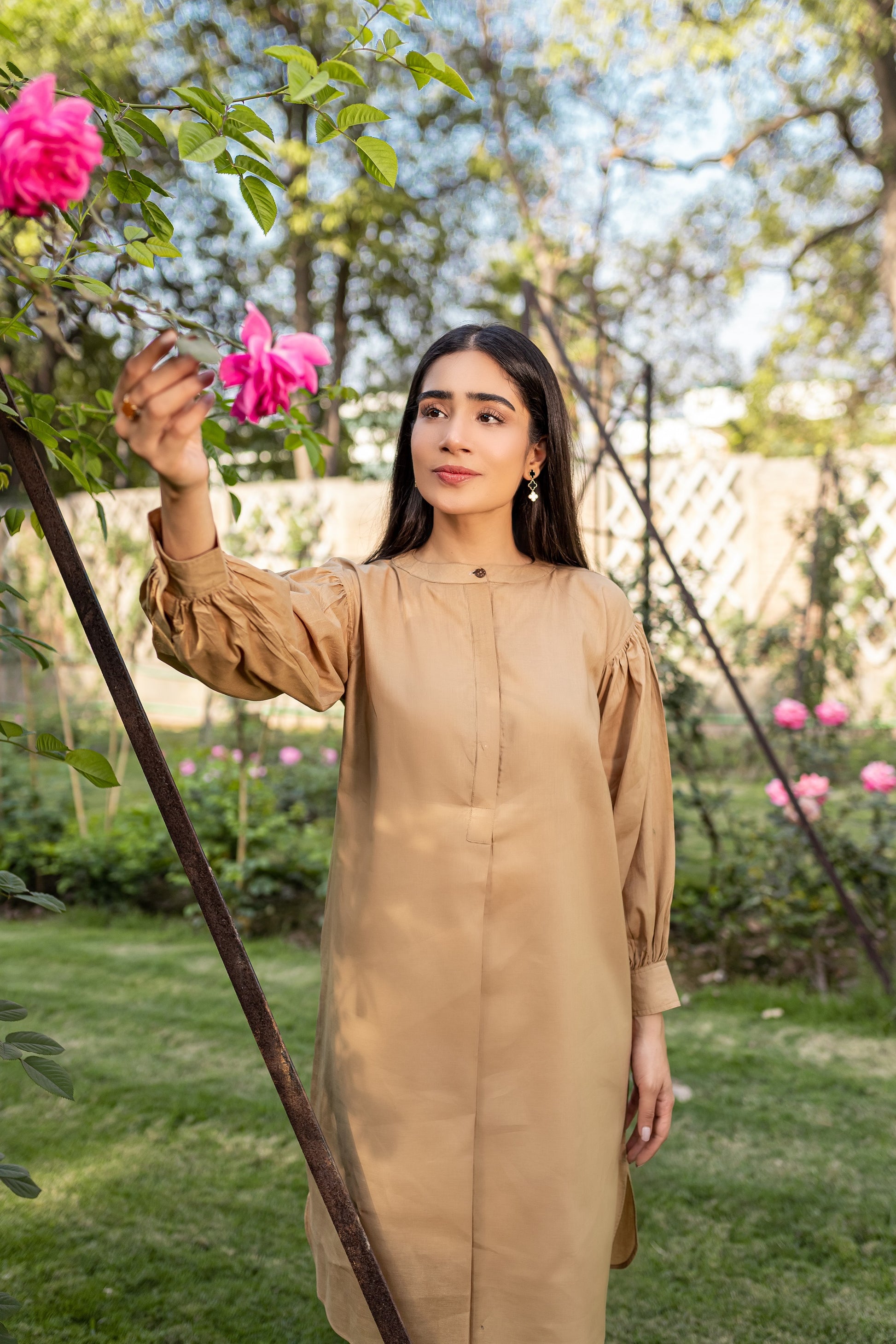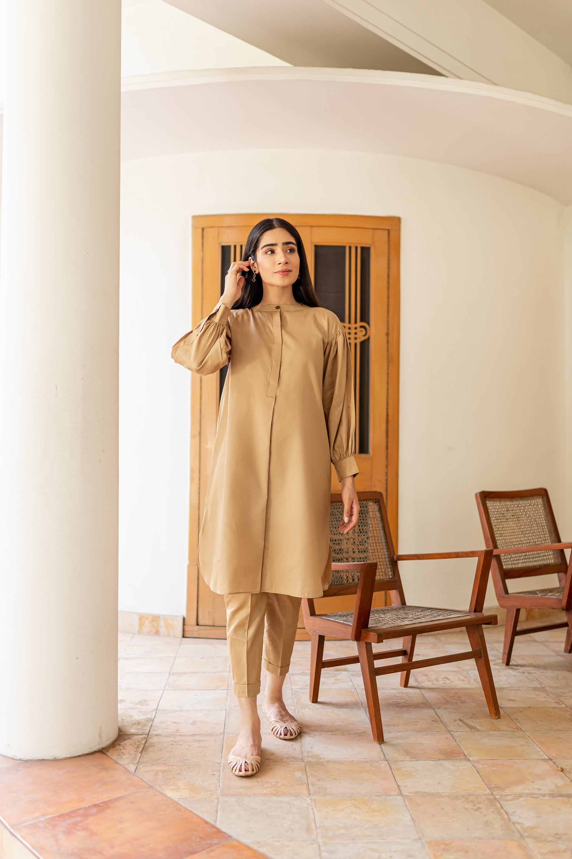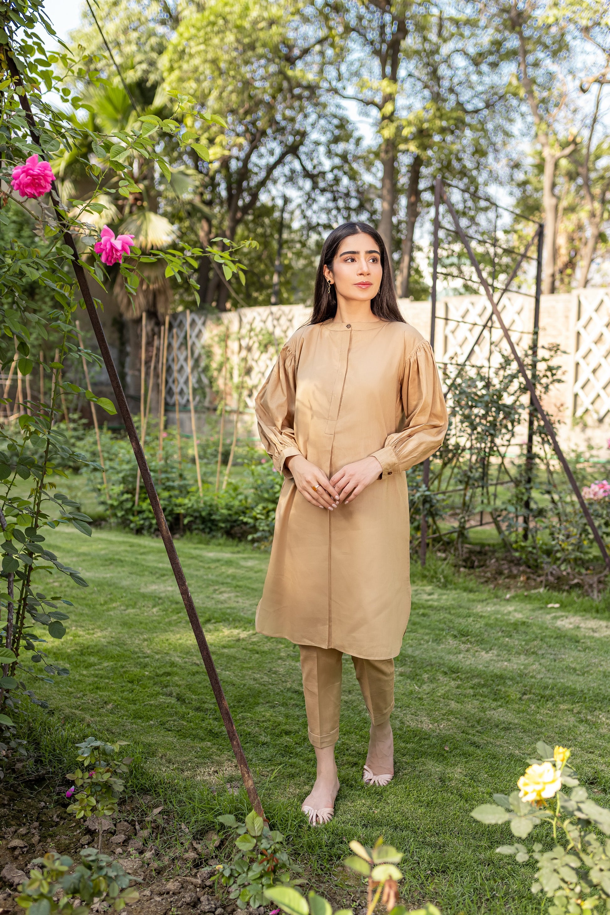 Description: A khakee knee length shirt in premium cotton, stitched to detail with band collar & balloon sleeves. It is paired with straight pants.