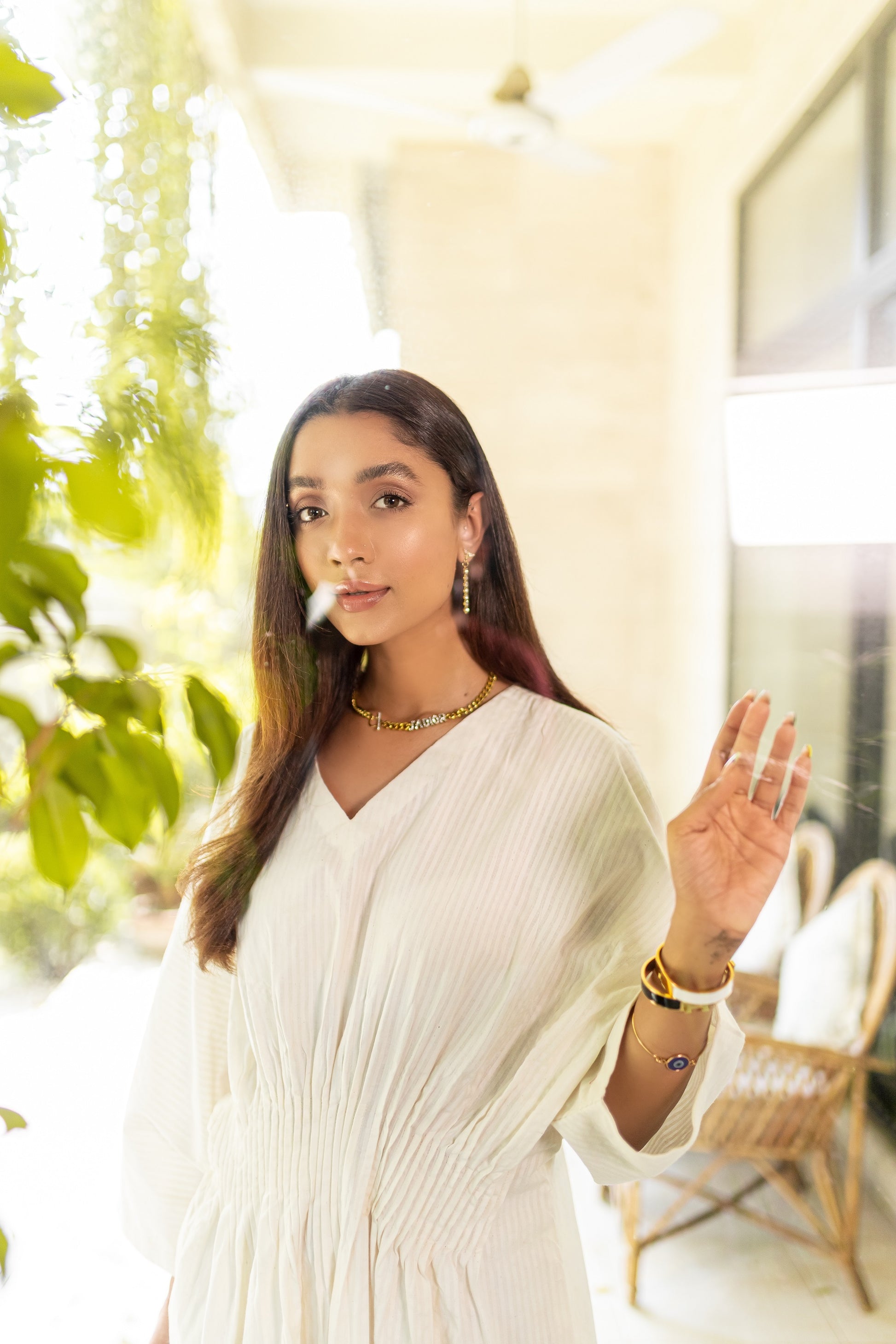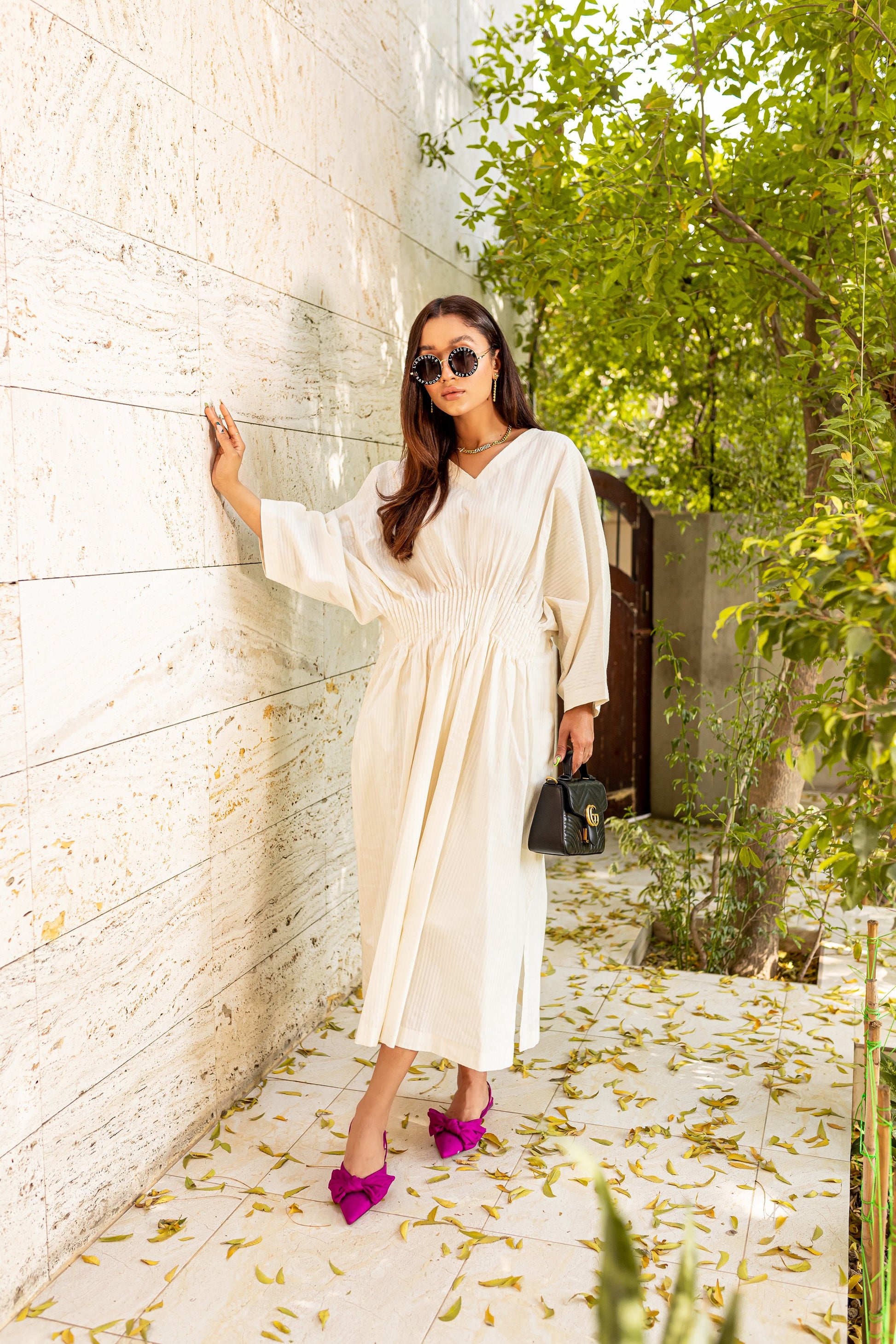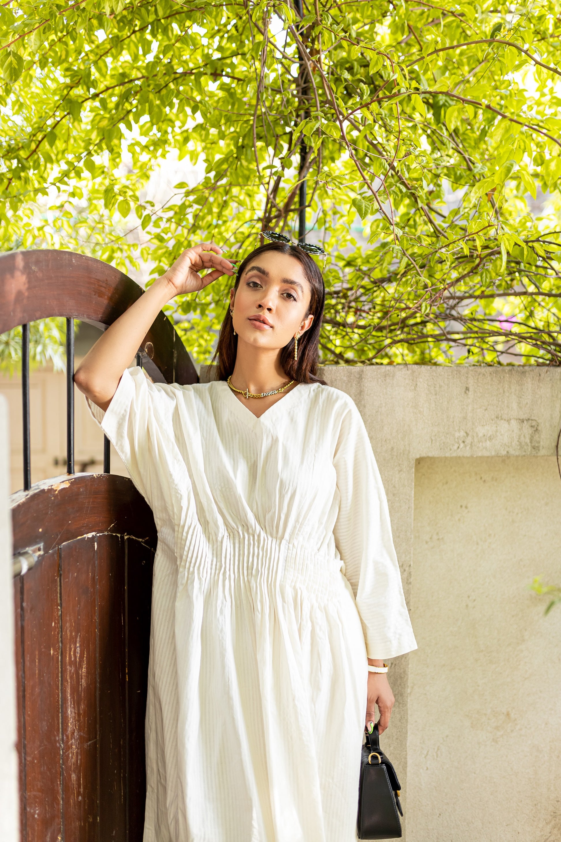 Description: Cotton white mid-length kaftan with gathered pleats at waist & side slits, is the perfect summer pick.