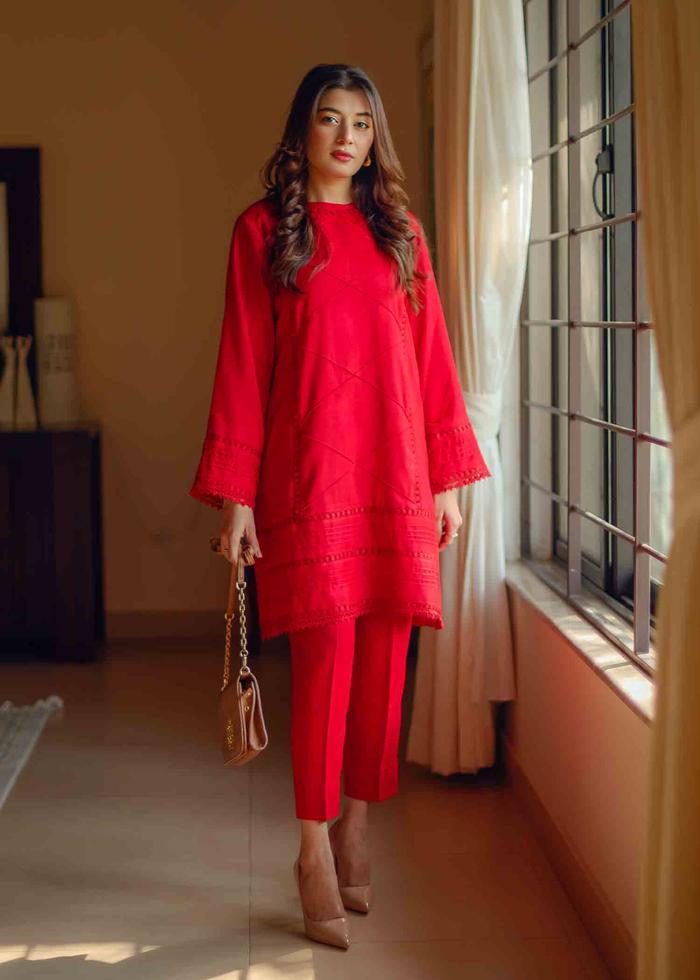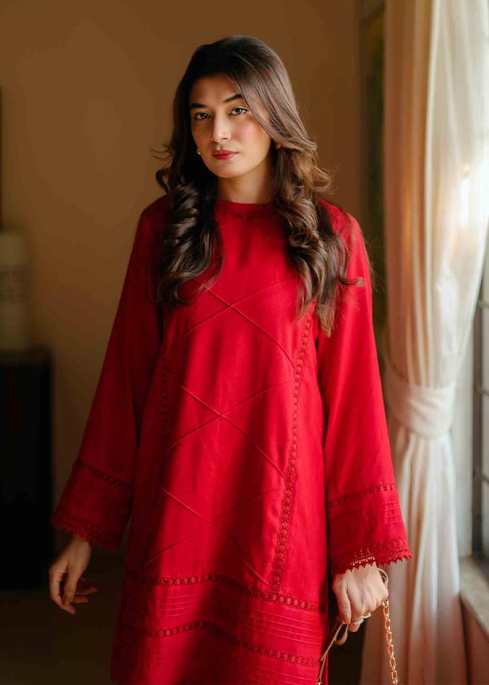Description: A knee-length straight cut kameez stitched with pleat & lace inlets. It’s paired with slim pants.